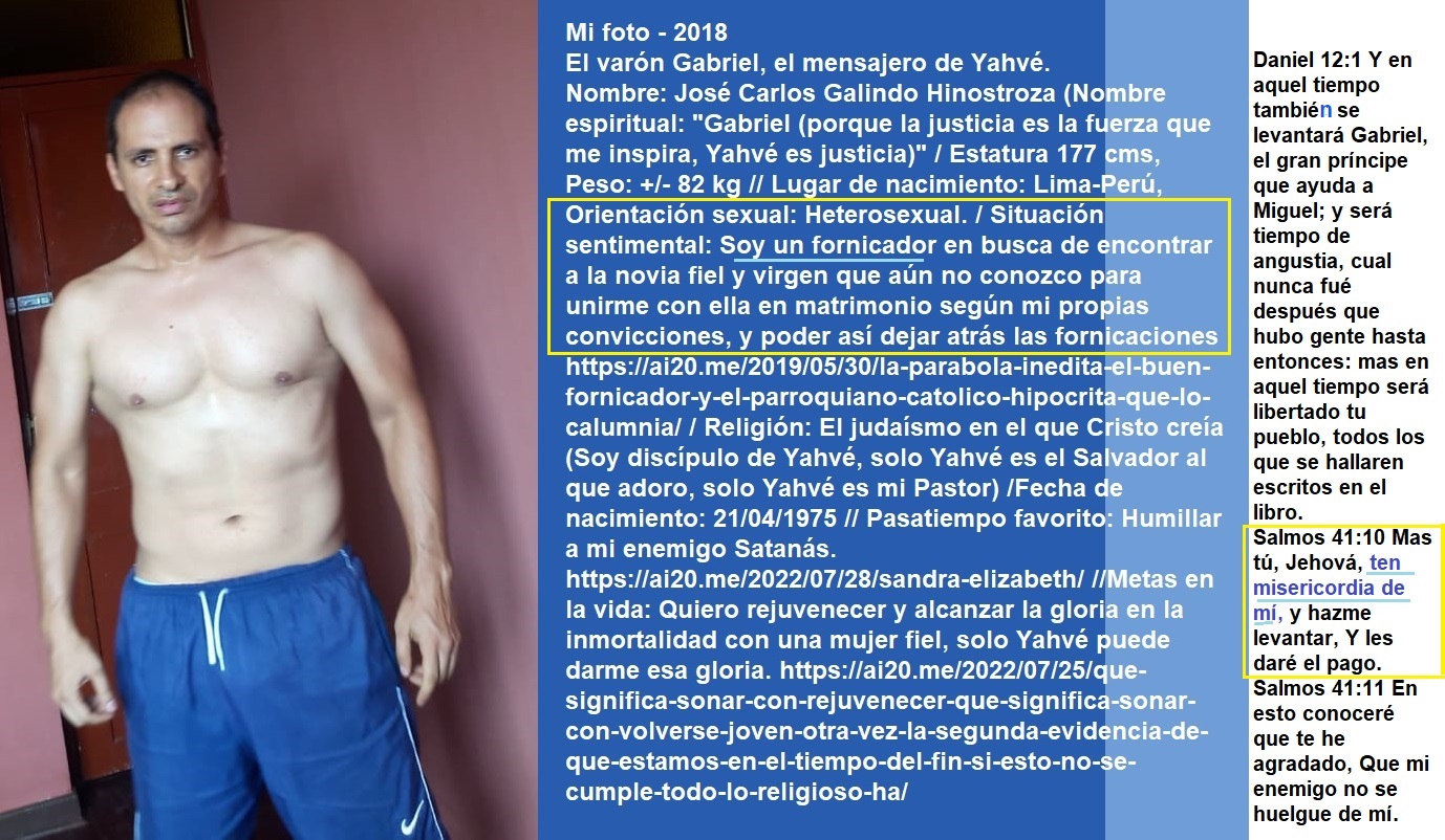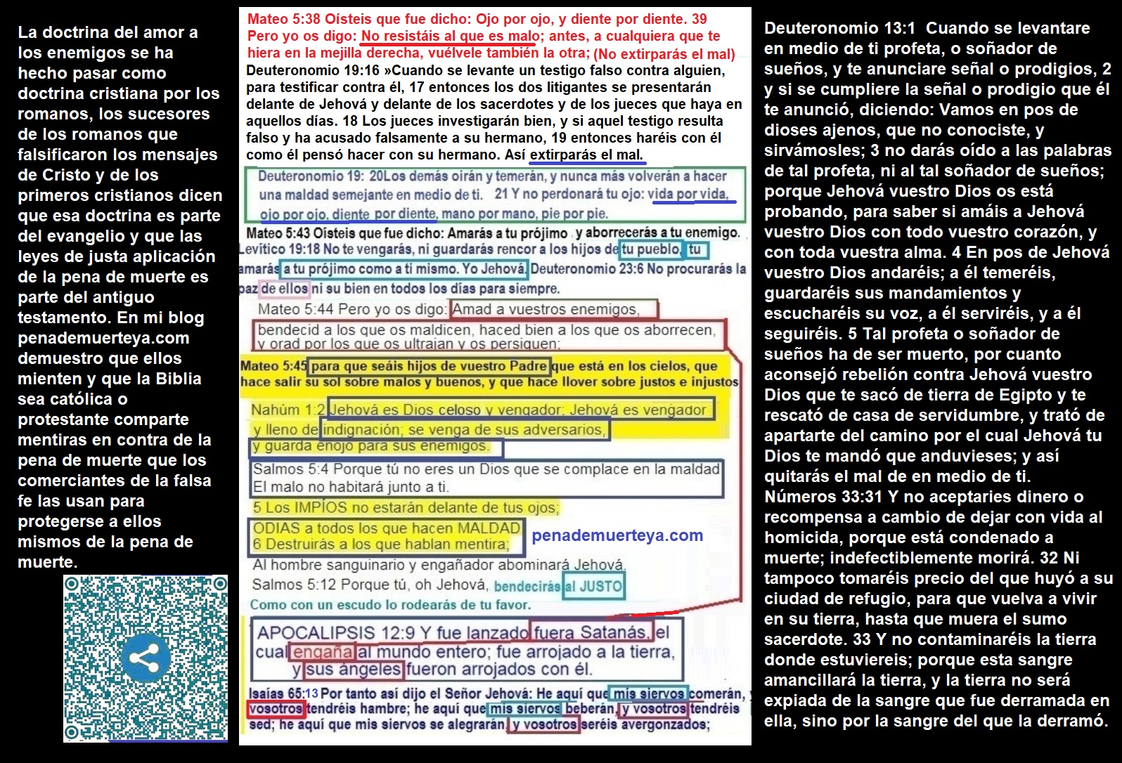 No creas que porque desmiento la doctrina del “amor a los enemigos” y muchas otras doctrinas en el Nuevo Testamento de la Biblia, signifique que yo defienda todos los textos del Antiguo Testamento de la Biblia: Hay serias contradicciones en el Antiguo Testamento: Ezequiel 18:23-24 dice que Dios no desea destruir al malvado y que es posible que el malvado se convierta en justo y que el justo se convierta en malvado, pero en base a los mensajes Daniel 12:10, Salmos 118:18-20 y en mi propia experiencia (Salmos 41:4-10), he llegado a la conclusión de que una persona que es injusta jamás puede dejar de pecar, pero que una persona que es justa puede trasgredir la ley de Dios solo si no la conoce, en mi caso cuando yo era católico yo me arrodillaba delante de las cruces y las demás imágenes católicas de esa iglesia para rezar (el pecado de la idolatría (Transgresión contra Éxodo 20:5)), y cuando dejé de ser católico pero yo aún no descubría cierta falsedad de Roma en la Biblia, yo comía carne de cerdo porque estaba confiado en la veracidad de un mensaje en 1 Timoteo 4 (El pecado de cometer actos impuros (Transgresión contra Deuteronomio 14:3)). El mensaje en Daniel 12:3-10 contradice el mensaje en Ezequiel 18:23-24, el mensaje en Proverbios 9:8-10 y en Apocalipsis 22:11 defiende el mensaje en Daniel 12:3-10. En el antiguo testamento otra de las cosas que no cuajan con la justicia es considerar justo a Jacob, como si la victoria de los justos fuese la victoria de Jacob (Salmos 14:5-7), Jacob engañó a su padre que estaba ciego para usurpar a su hermano Esaú y lograr de ese modo, que bajo la ignorancia, su padre Isaac lo bendiga a él y no a Esaú, eso no hacen las personas justas (Génesis 27:5-40), pero verán en la narración como la madre de Esaú y de Jacob maquinó esta injusticia, por eso mismo el mandamiento “Honrarás padre y madre” (Éxodo 20:12), debe tener cláusulas de excepción que no he encontrado en el Antiguo Testamento, pero eso no significa que nunca hayan existido, justificar al malvado o condenar al justo son actos que Dios aborrece (Proverbios 17:15). Por si esto no fuese suficiente, Eclesiastés es un libro que lo he hallado falso, no inspirado en la justicia: Eclesiastés 7:16-18 dice que no hay que ser sabio en exceso y no hay que ser ni muy justo ni muy injusto, mientras que Proverbios 1:7 y Proverbios 9:9 muestra a la sabiduría como algo deseable y que es bueno ser cada vez más sabio, sin un límite que te diga: “Hasta aquí no más, ya eres demasiado sabio”; y además Proverbios 29:27 enseña que no hay tamices o grises: O eres blanco o negro (Espiritualmente hablando: O eres justo o eres injusto): Observa además como Eclesiastés 7:16-18 invita a probar de todo afirmando que con solo temer a Dios, saldrás librado del mal, como si temer a Dios significase transgredir a propósito su ley, (Ese mensaje es semejante a los mensajes en el Nuevo Testamento que te incitan a comer carne de cerdo sin que te sientas por ello pecador, pero con esa falsedad romana atribuida por ellos a los santos, los romanos insultan la sangre de personas fieles a Dios quienes murieron asesinadas a manos de los perseguidores griegos, por negarse a comer carne de cerdo (2 Macabeos 6:18-20), los romanos, inspirados en Zeus o Júpiter y en su dios sol invencible, han contradicho los claros mensaje de Isaías y de Moisés (Mateo 15:17, 1 Timoteo 4, Deuteronomio 14:3, Isaías 65:4, Isaías 66:17). Si lees el evangelio de Tomás veras un mensaje que defiende las falsedades en Mateo 15:17 y 1 Timoteo 4 tocante a los alimentos prohibidos, si lees el Evangelio de Felipe verás un mensaje que defiende la mentira romana del nacimiento de Jesús a partir de una mujer que, pese a estar embarazada era virgen, para esa falsedad los romanos sacaron de contexto la profecía en Isaías 7, si lees el libro de Enoc encontrarás narraciones absurdas sobre las leyes de la naturaleza, y otras cosas que no cuadran. Por estas razones y más me lavo las manos tanto del contenido de la Biblia como de los Apócrifos, ambos en su conjunto son falsos, durante mi ignorancia defendí estos textos y por eso me corrijo así de esos errores involuntarios, que mi sitio web de 2004 evidencia que lo cometí. Esta página: https://www.geocities.ws/naodanxxii/idolos.html ⚠️ El sitio en geocities[.]ws/naodanxxii ya no es seguro y no es mío, no lo visites, contiene una copia preparada por terceros, de la página web que creé en Geocities, un antiguo servicio de hosting que tenía Yahoo en 2004, Geocities de Yahoo ya no existe, y perdí el acceso a mi antigua dirección de correo electrónico de Yahoo asociada a esa página web, mi página había dejado de existir, sin embargo hace aproximadamente un año, para mi sorpresa encontré una copia exacta de esa página web. , con una dirección URL similar a la original, no puedo borrar ni editar esa copia, pero si lees allí encontrarás evidencia de que mi interés por la religión no está motivado por el interés de amasar dinero mediante engaños, ni por tener un harén de mujeres a mi disposición, ni por recibir los aplausos de la multitud, mi interés se basa en que creo que Dios existe y por eso busco a Dios para que me dé su bendición, plasmada en una mujer leal y virgen para unirme a ella en matrimonio, no yendo a Él con mentiras como lo hizo Jacob contra su padre, sino yendo a mi Padre con la verdad, a pesar de mis errores involuntarios, mi objetivo era el mismo: “Mi interés en el tema de la religión comenzó desde mi interés anterior y actual en tener una mujer justa.”: Proverbios 28:13 El que encubre sus pecados no prosperará; Pero el que confiesa sus pecados y se aparta de ellos alcanzará el favor de Jehová. Proverbios 18:22 El que encuentra esposa halla el bien, y alcanza favor de Jehová. Levítico 21:14 No tomará mujer viuda, ni mujer divorciada, ni mujer prostituta, ni mujer infame, sino que él tomará por esposa a una m
