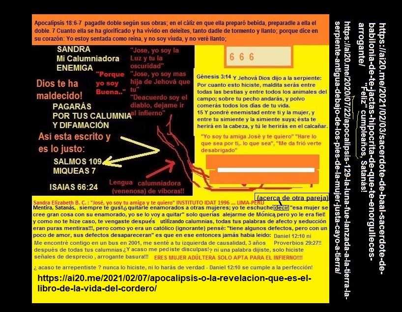 La serpiente, el diablo o Satanás (el calumniador) en el infierno (Isaías 66:24, Marcos 9:44). Mateo 25:41: “Entonces dirá también a los de su izquierda: ‘Apartaos de mí, malditos, al fuego eterno que ha sido preparado para el diablo y sus ángeles’.” El infierno: el fuego eterno preparado para la serpiente y sus ángeles (Apocalipsis 12:7-12), por haber combinado verdades con herejías en la Biblia, el Corán, la Torá y por haber creado falsos evangelios prohibidos que llamaron apócrifos, para darle credibilidad a mentiras en los falsos libros sagrados, todo esto en rebelión contra la justicia.
