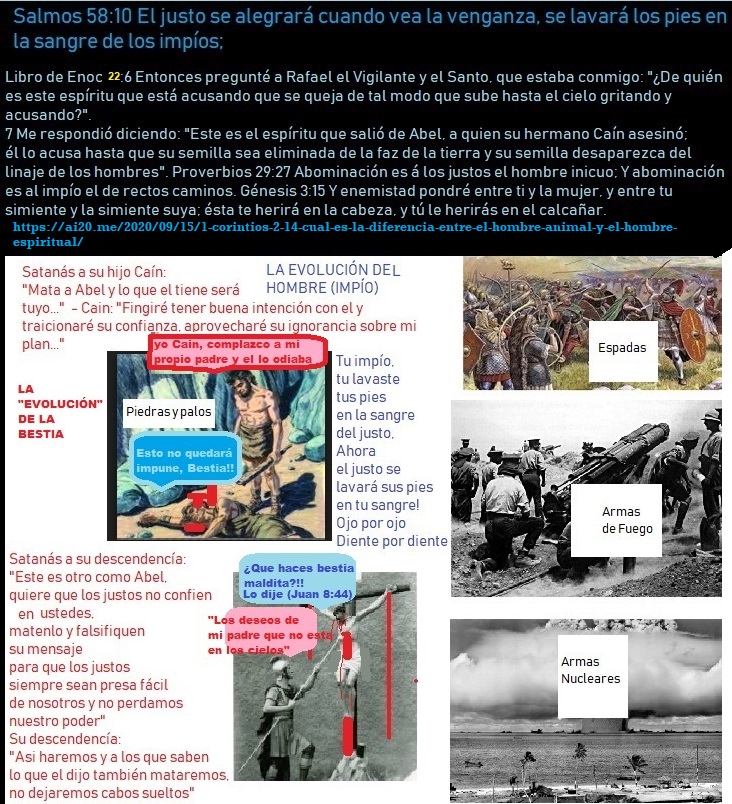 Libro de Enoc 94:10: “Injustos, les digo a ustedes que quién los ha creado los derrocará; sobre la ruina de ustedes Dios no tendrá misericordia, por el contrario, Dios se alegrará de la destrucción de ustedes.” Satanás y sus ángeles en el infierno: la muerte segunda. Se lo merecen por mentir contra Cristo y sus fieles discípulos, acusándolos de ser los autores de las blasfemias de Roma en la Biblia, como el amor al diablo (el enemigo).