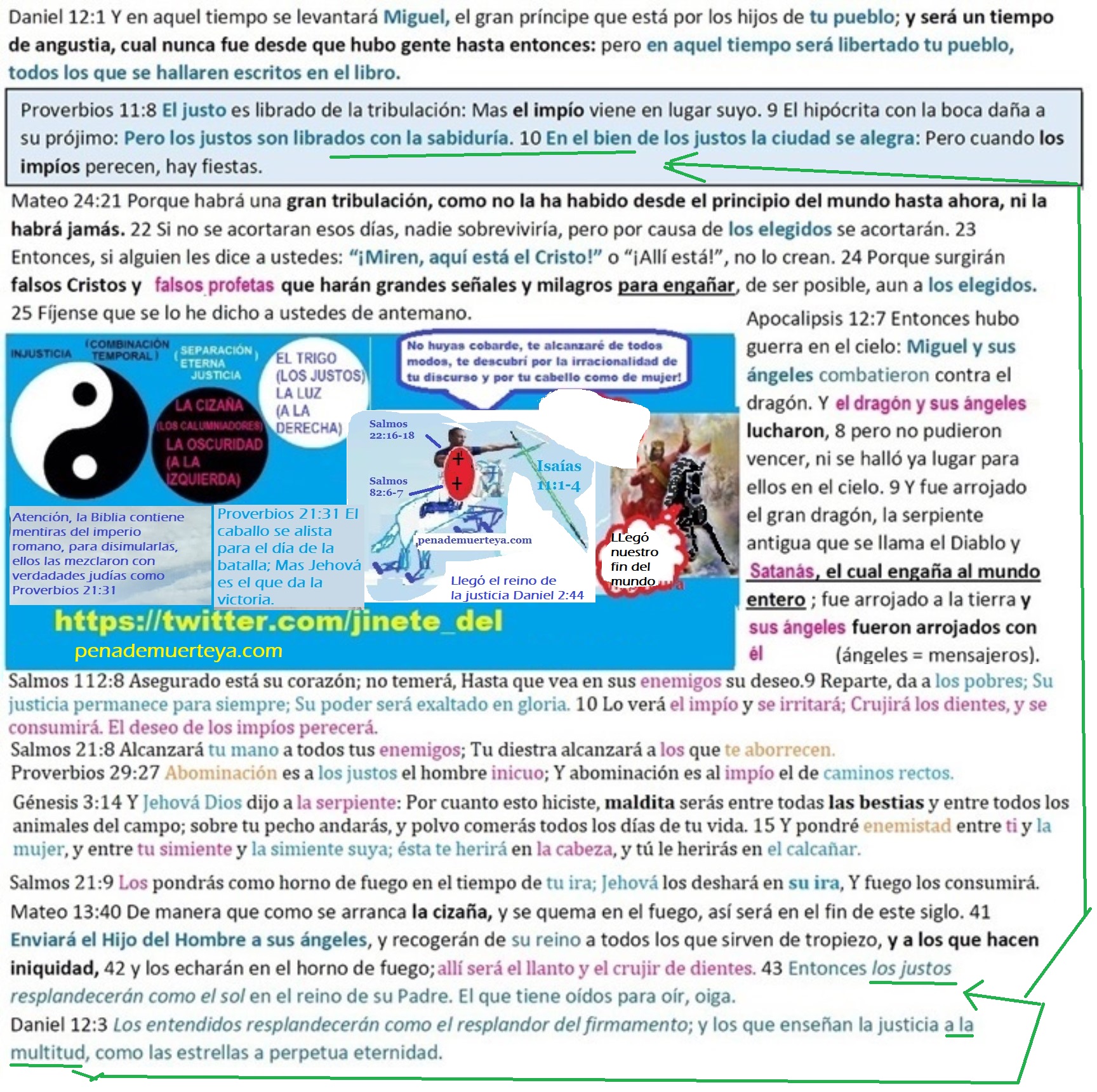 Fijado por Jose Galindo @JoseGalindo-sy2mj hace 1 día (editado) Esto es para limpiar mi imagen de las calumnias: Proverbios 22:1 Es mejor la buena reputación que las muchas riquezas, y mejor ser tenido en buena estima que tener oro y plata. Satanás es el maligno, el mentiroso, el gran engañador del mundo entero, actuó como perseguidor en los perseguidores romanos, y dos mil años después mucha gente cree que Satanás ha respetado la palabra que persiguió y que la predica en las principales religiones del mundo, en la Biblia, en el Corán o en la Torá: Antecedentes: Satanás por medio de los griegos (Y por eso se le mencionó a Daniel acerca «del adversario del arcángel Miguel, el príncipe de Grecia (Daniel 10:20)), por medio de los griegos el malvado Satanás torturó al anciano Eleazar, y a siete hermanos judíos, y a la madre de ellos, porque se negaron a comer carne de cerdo, a quebrantar la ley de los alimentos prohibidos (Levítico 11, 2 Macabeos 6, 2 Macabeos 7), algunos de los siete hermanos le dijeron al rey Antioco que por morir por las leyes de Dios ellos resucitarán para heredar la vida eterna, y que en cambio, el rey perseguidor será atormentado por su maldad, sin embargo el Diablo, de la mano del imperio romano nos presenta un evangelio dónde en su nuevo testamento hay muchos pasajes dónde nos dicen que ya podemos comer de todo (1 Timoteo 4, Mateo 15:17), y de esa forma contradicen la ley (Deuteronomio 14) y los profetas (Isaías 66:17-66), y por si no fuese eso suficiente blasfemia, la heredera del imperio romano tiene entre sus ángeles a Cupido, el dios de los griegos, el dios de los perseguidores, si buscas en internet «los siete arcángeles» vas a encontrarte con imágenes de siete seres a los que le dieron nombres ajenos, tienen nombres masculinos, pero que sin embargo se visten como mujeres, tienen el cabello largo y lucen afeminados en extremo, ellos no tienen nada que ver con los legítimos ángeles de Dios, quienes eran varones (Daniel 12:7), como los varones que salvaron con el poder de Dios a Lot de Sodoma (Génesis 19, Génesis 13:13), varones fieles a Dios y por lo tanto con una apariencia personal acorde a las leyes que a Dios le agradan (Deuteronomio 22:5), sin embargo la serpiente sigue engañando a la gente, se disfraza de ángel de luz no con su apariencia personal sino con los nombres de los buenos, mientras que le enciende velas a las esculturas y las adora (Isaías 10:11, Isaías 2:8, Habacuc 2:18-20), además, por medio de milagros engañosos, que Dios le concede hacer para poner a prueba a los hombres (Deuteronomio 13, 2 Tesalonicenses 2:11), le pide a la gente que adore dioses ajenos contraviniendo sus mandamientos (Éxodo 20:5, Isaías 2:8), y es que rezarle a cosas creadas es tener dioses ajenos al único Dios que hizo a todos, nunca olviden que es Dios quien controla al Diablo (Isaías 10:15), Dios controla a todos, tanto a los verdaderos ángeles de luz como a los impostores (Proverbios 21:31), y Dios me tiene aquí a mi para limpiar mi imagen de las calumnias de Satanás (Satanás significa calumniador y no se esperaba otra cosa de él y de sus ángeles), yo no tengo nada que ver ni con sus gustos por el celibato (Mateo 19:12, Mateo 22:30), ni con su apariencia contraria a los mandatos de Dios (1 Corintios 11:14-15, Deuteronomio 22:5), ni con sus imágenes, ni con la doctrina del amor a los enemigos, ¿quién hace guerra amando a sus enemigos y a sus amigos?, el la guerra solo se ama a los amigos, las palabras son armas y hay una guerra entre los verdaderos ángeles (mensajeros) leales a las justas leyes de Dios (Números 35:33) en contra de los ángeles usurpadores (Apocalipsis 12:7). Los verdaderos varones de Dios luchan por la gloria, el honor y la inmortalidad (Romanos 2:7, Levítico 21:13-14, Job 33:25, Salmos 118:17, Salmos 16:10), 1 Corintios 11:7 La mujer es la gloria del hombre. Levítico 21:13 Y tomará por esposa a una mujer virgen. , pero, ¿Qué sabe el Diablo de honores si él es un traidor y calumniador?, Zeus, que es otro dios griego usurpador, ha escogido el celibato porque el prefiere dedicarse a tiempo completo a sus discípulos y no a una esposa, ¿Qué entiende el Diablo de mis sagrados intereses o de la justicia?. Deuteronomio 32:43 Alabad, naciones, a su pueblo, Porque él vengará la sangre de sus siervos, Y tomará venganza de sus enemigos, Y hará expiación por la tierra de su pueblo. Números 35:33 Y no contaminaréis la tierra donde estuviereis; porque esta sangre amancillará la tierra, y la tierra no será expiada de la sangre que fue derramada en ella, sino por la sangre del que la derramó. «Satanás, aunque no salgas de tu cueva, igual el castigo del eterno caerá sobre ti y tus malvados cómplices, no hay lugar dónde te puedas esconder con seguridad de la ira del Eterno, nuestro Dios Yahvé el eterno creador». Jeremías 51:53 Aunque suba Babilonia hasta el cielo, y se fortifique en las alturas, de mí vendrán a ella destruidores, dice Jehová. Isaías 5:10 ¡Ay de los que dictan leyes injustas, y prescriben tiranía, 2 para apartar del juicio a los pobres, y para quitar el derecho a los afligidos de mi pueblo; para despojar a las viudas, y robar a los huérfanos! 3 ¿Y qué haréis en el día del castigo? ¿A quién os acogeréis para que os ayude, cuando venga de lejos el asolamiento? ¿En dónde dejaréis vuestra gloria?. Jeremías 51:6 Huid de en medio de Babilonia, y librad cada uno su vida, para que no perezcáis a causa de su maldad; porque el tiempo es de venganza de Jehová; le dará su pago. 7 Copa de oro fue Babilonia en la mano de Jehová, que embriagó a toda la tierra; de su vino bebieron los pueblos; se aturdieron, por tanto, las naciones. Apocalipsis 13:4 Y oí otra voz del cielo, que decía: Salid de ella, pueblo mío, para que no seáis partícipes de sus pecados, ni recibáis parte de sus plagas; 5 porque sus pecados han llegado hasta el cielo, y Dios se ha acordado de sus