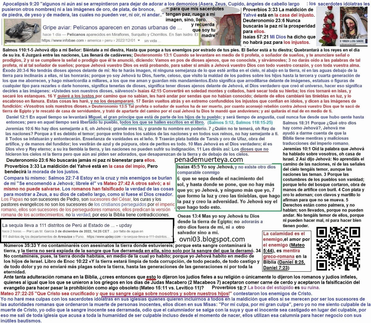 No creas que porque desmiento la doctrina del “amor a los enemigos” y muchas otras doctrinas en el Nuevo Testamento de la Biblia, signifique que yo defienda todos los textos del Antiguo Testamento de la Biblia: Hay serias contradicciones en el Antiguo Testamento: Ezequiel 18:23-24 dice que Dios no desea destruir al malvado y que es posible que el malvado se convierta en justo y que el justo se convierta en malvado, pero en base a los mensajes Daniel 12:10, Salmos 118:18-20 y en mi propia experiencia (Salmos 41:4-10), he llegado a la conclusión de que una persona que es injusta jamás puede dejar de pecar, pero que una persona que es justa puede trasgredir la ley de Dios solo si no la conoce, en mi caso cuando yo era católico yo me arrodillaba delante de las cruces y las demás imágenes católicas de esa iglesia para rezar (el pecado de la idolatría (Transgresión contra Éxodo 20:5)), y cuando dejé de ser católico pero yo aún no descubría cierta falsedad de Roma en la Biblia, yo comía carne de cerdo porque estaba confiado en la veracidad de un mensaje en 1 Timoteo 4 (El pecado de cometer actos impuros (Transgresión contra Deuteronomio 14:3)). El mensaje en Daniel 12:3-10 contradice el mensaje en Ezequiel 18:23-24, el mensaje en Proverbios 9:8-10 y en Apocalipsis 22:11 defiende el mensaje en Daniel 12:3-10. En el antiguo testamento otra de las cosas que no cuajan con la justicia es considerar justo a Jacob, como si la victoria de los justos fuese la victoria de Jacob (Salmos 14:5-7), Jacob engañó a su padre que estaba ciego para usurpar a su hermano Esaú y lograr de ese modo, que bajo la ignorancia, su padre Isaac lo bendiga a él y no a Esaú, eso no hacen las personas justas (Génesis 27:5-40), pero verán en la narración como la madre de Esaú y de Jacob maquinó esta injusticia, por eso mismo el mandamiento “Honrarás padre y madre” (Éxodo 20:12), debe tener cláusulas de excepción que no he encontrado en el Antiguo Testamento, pero eso no significa que nunca hayan existido, justificar al malvado o condenar al justo son actos que Dios aborrece (Proverbios 17:15). Por si esto no fuese suficiente, Eclesiastés es un libro que lo he hallado falso, no inspirado en la justicia: Eclesiastés 7:16-18 dice que no hay que ser sabio en exceso y no hay que ser ni muy justo ni muy injusto, mientras que Proverbios 1:7 y Proverbios 9:9 muestra a la sabiduría como algo deseable y que es bueno ser cada vez más sabio, sin un límite que te diga: “Hasta aquí no más, ya eres demasiado sabio”; y además Proverbios 29:27 enseña que no hay tamices o grises: O eres blanco o negro (Espiritualmente hablando: O eres justo o eres injusto): Observa además como Eclesiastés 7:16-18 invita a probar de todo afirmando que con solo temer a Dios, saldrás librado del mal, como si temer a Dios significase transgredir a propósito su ley, (Ese mensaje es semejante a los mensajes en el Nuevo Testamento que te incitan a comer carne de cerdo sin que te sientas por ello pecador, pero con esa falsedad romana atribuida por ellos a los santos, los romanos insultan la sangre de personas fieles a Dios quienes murieron asesinadas a manos de los perseguidores griegos, por negarse a comer carne de cerdo (2 Macabeos 6:18-20), los romanos, inspirados en Zeus o Júpiter y en su dios sol invencible, han contradicho los claros mensaje de Isaías y de Moisés (Mateo 15:17, 1 Timoteo 4, Deuteronomio 14:3, Isaías 65:4, Isaías 66:17). Si lees el evangelio de Tomás veras un mensaje que defiende las falsedades en Mateo 15:17 y 1 Timoteo 4 tocante a los alimentos prohibidos, si lees el Evangelio de Felipe verás un mensaje que defiende la mentira romana del nacimiento de Jesús a partir de una mujer que, pese a estar embarazada era virgen, para esa falsedad los romanos sacaron de contexto la profecía en Isaías 7, si lees el libro de Enoc encontrarás narraciones absurdas sobre las leyes de la naturaleza, y otras cosas que no cuadran. Por estas razones y más me lavo las manos tanto del contenido de la Biblia como de los Apócrifos, ambos en su conjunto son falsos, durante mi ignorancia defendí estos textos y por eso me corrijo así de esos errores involuntarios, que mi sitio web de 2004 evidencia que lo cometí. Esta página: https://www.geocities.ws/naodanxxii/idolos.html ⚠️ El sitio en geocities[.]ws/naodanxxii ya no es seguro y no es mío, no lo visites, contiene una copia preparada por terceros, de la página web que creé en Geocities, un antiguo servicio de hosting que tenía Yahoo en 2004, Geocities de Yahoo ya no existe, y perdí el acceso a mi antigua dirección de correo electrónico de Yahoo asociada a esa página web, mi página había dejado de existir, sin embargo hace aproximadamente un año, para mi sorpresa encontré una copia exacta de esa página web. , con una dirección URL similar a la original, no puedo borrar ni editar esa copia, pero si lees allí encontrarás evidencia de que mi interés por la religión no está motivado por el interés de amasar dinero mediante engaños, ni por tener un harén de mujeres a mi disposición, ni por recibir los aplausos de la multitud, mi interés se basa en que creo que Dios existe y por eso busco a Dios para que me dé su bendición, plasmada en una mujer leal y virgen para unirme a ella en matrimonio, no yendo a Él con mentiras como lo hizo Jacob contra su padre, sino yendo a mi Padre con la verdad, a pesar de mis errores involuntarios, mi objetivo era el mismo: “Mi interés en el tema de la religión comenzó desde mi interés anterior y actual en tener una mujer justa.”: Proverbios 28:13 El que encubre sus pecados no prosperará; Pero el que confiesa sus pecados y se aparta de ellos alcanzará el favor de Jehová. Proverbios 18:22 El que encuentra esposa halla el bien, y alcanza favor de Jehová. Levítico 21:14 No tomará mujer viuda, ni mujer divorciada, ni mujer prostituta, ni mujer infame, sino que él tomará por esposa a una m