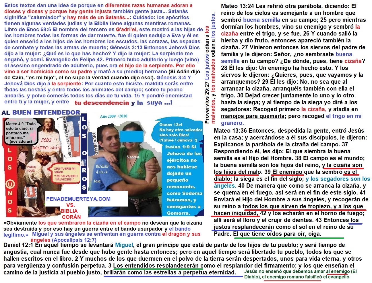 Y mi parábola favortita: La parábola de los labradores malvados además de predicar la venganza justa y el odio a los enemigos, desmiente la resurrección y posterior ascención de Jesús al cielo de Jesús, contradice a Hechos 1, a la mentira en Hechos 1, una de las muchas falsedades romanas contra el verdadero testimonio de los fieles testigos.