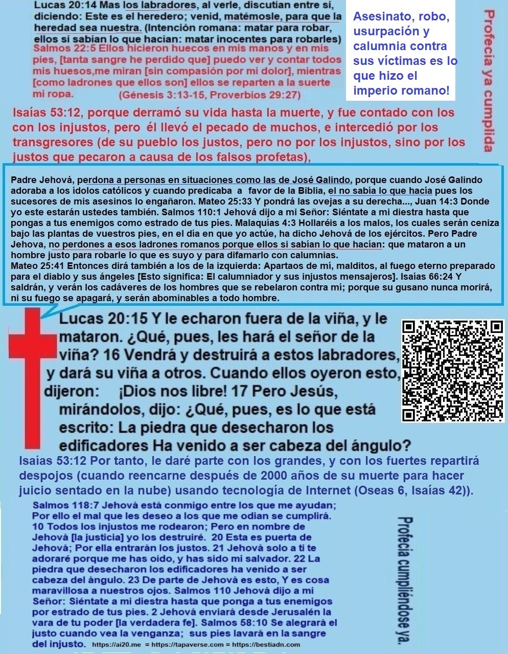 Nos engañaron: «Jesús no resucitó al tercer día», Oseas 6: 1-3 habla de más de una sola persona y habla de volver a vivir después de 2 días; pero se refiere al 3er milenio porque un día equivale a 1000 años en muchas profecías (Salmos 90:4), por lo tanto, afirmar que los justos vuelven a vivir después de dos días, equivale a afirmar que ellos vuelven a vivir después de dos mil años después de un evento especial, ese evento especial es la muerte de Jesús en la cruz a favor de ellos, los escogidos (Salmos 22, Salmos 118:20), esto es el tercer milenio, ese tiempo es este y coincide con era de la Internet, y solo con esta tecnología es posible que se cumpla la profecía en Isaías 42:1-4 porque hay que juzgar sin alzar la voz en las calles, y a naciones lejanas, y hacerlo hasta hacer triunfar la justicia, la profecía del juicio final en Isaías 42 y Salmos 110 es posible solo con la Internet, se juzga con palabras, y Dios usa a sus mensajeros para transmitirlas en el tiempo del juicio final (1 Corintios 6:2, Ezequiel 23:25), la expresión estar en el cielo significa estar a la diestra de Dios, y hay más de uno en el cielo en el tiempo del fin (Salmos 110:1-3, Isaías 51:12-16, Salmos 118:6-7, Apocalipsis 12:10). El regreso de Jesús desde el cielo que contiene los vientos y las nubes y con el mismo cuerpo restaurado y los mismos recuerdos que Jesús tuvo hace dos mil años es incompatible con las profecías en Salmos 118 a la que Jesús hizo referencia en la parábola de los labradores malvados (Mateo 21:33-43), repito: solo por medio de la internet es posible juzgar al mundo sin levantar las voz en las calles y plazas, la internet hace posible juzgar a naciones distantes a la velocidad del relámpago, como dice la parábola sobre el regreso de Cristo (Mateo 22:47), en una guerra la trompeta es un medio de comunicación porque emite un mensaje (Apocalipsis 12:7), así los mensajes que difunden los mensajeros justos son armas de guerra contra los mensajeros malvados quienes difunden de manera intencional mensajes falsos contra el verdadero mensaje de Dios, esas mentiras están enquistadas en la Biblia, y son obra de las manos corruptas del imperio romano contra el mensaje de los escogidos: Mateo 24:1-49 y Hechos 1:26-27 nos dicen que después de morir Jesús resucitó al tercer día y luego de unos 40 días el se elevó levitando al cielo en vista de varios testigos, pero eso es falso; los romanos han hecho pasar algunas profecías pendientes para el tiempo del fin como profecías ya cumplidas (Por ejemplo Salmos 109 y Salmos 91), ellos inventaron la existencia de un traidor como Judas Iscariote, para decir que la maldición en la profecía Salmos 109 se cumplió contra él, pero esa profecía se trata de una profecía a cumplirse en simultáneo con aquellas en Salmos 118, y Salmos 112 y que son para el tiempo del fin al igual que Isaías 42; la profecía sobre el traidor dice que el traicionado confiaba en el traidor, y contextuando Salmos 41 hay más de un traidor; Salmos 41 también se trataría de una profecía para el tiempo del fin, lo mismo que la de Salmos 109, Salmos 118, Miqueas 7:5-13 y Daniel 12:1-3. Según la versión romana de los hechos de Jesús (Juan 6:64), el ya sabía de antemano quién lo iba a traicionar porque el no era un ser humano común con los 5 sentidos básicos que tengo yo por ejemplo, sino un ser con superpoderes sensoriales, nadie confía en aquel de quién de antemano ya sabe que es un traidor, y la profecía en Salmos 41, a la que los romanos han querido hacer pasar por profecía cumplida con Cristo, dice con claridad que la víctima de la traición confiaba en el traidor. El regreso de Jesús no es el mismo cuerpo de su primera vida porque no resucitó, su cuerpo se hizo polvo, la profecía que dice que el santo mensajero de Dios no verá corrupción corporal es una profecía relacionada con la vida eterna para los justos cuando ellos vuelvan a la vida para heredar la inmortalidad, el honor y la gloria (Daniel 7:1-27, Salmos 118:17-20, Salmos 16:10, Daniel 12:1, Proverbios 19:14, Job 33:25, Levítico 21:13), el único modo de hacerlo es por medio de la reencarnación pues Salmos 118 hace evidente que ellos tienen que ser reprendidos porque no conocen la verdad durante un tiempo ya que deben conocer la sabiduría para librarse de la gran tribulación (Proverbios 11:8-9, El anciano de Días representa la sabiduría: con sabiduría los santos destruyen a la cuarta bestia: el imperio mundial dirigido por los falsos profetas quienes en torno al Cesar consultan unidos contra Dios y contra su pueblo escogido (Salmos 2; Apocalipsis 19:19-21). La mentira romana en Hechos 1: 1-26 es incongruente con la verdad Mateo 21: 33-44 (Salmos 118: 7-23). Los romanos han destruido casi totalmente el evangelio y la Biblia representa esa burla romana contra Dios, pero las profecías verdaderas no dejan de ser eso y se cumplen por ese mismo motivo, y Yahvé, el dios de los justos, demostrará con sus hechos que solo ama a sus amigos y que solo odia a sus enemigos.