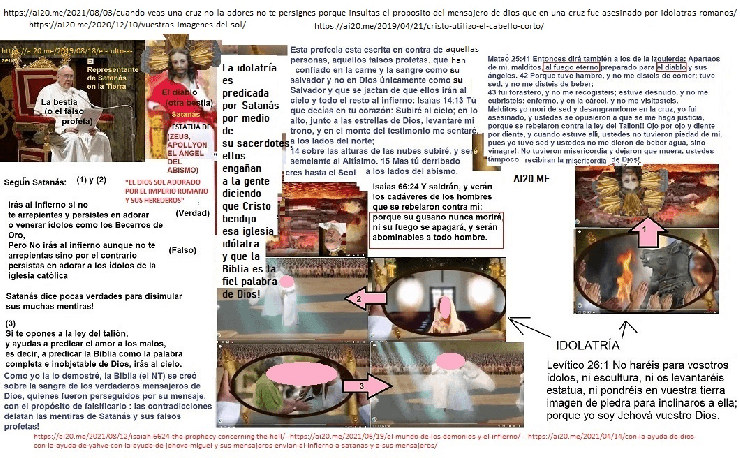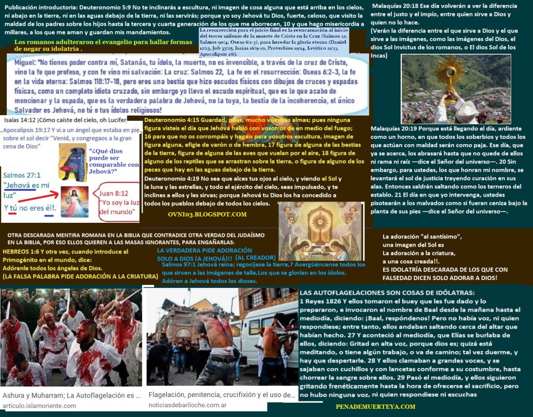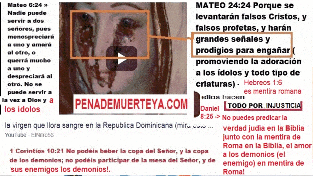 Ni en la descripción ni en el título hay suficiente espacio para describir el rico contenido de este video y de mi página web, mejor es visitarlo, pero promete no enloquecer, el mensaje es un mensaje fuerte y pocos lo sobreviven: Si eres de aquellos que habiendo leído más del 50% de la Biblia permance cerrado en que la Biblia no contiene mentiras, entonces enloquecerás más de lo que ya estas, esas mentiras proceden de los romanos, quienes hicieron pasar «sus mandamientos de hombres» por mandamientos divinos, pobres imbéciles: Isaías 5: ¡Ay de los que a lo malo dicen bueno, y a lo buenomalo; que hacen de la luztinieblas, y de las tinieblas luz; que ponen lo amargo por dulce, y lo dulce por amargo! 21 ¡Ay de los sabios en sus propios ojos, y de los que son prudentes delante de sí mismos! 22 ¡Ay de los que son valientes para beber vino, y hombres fuertes para mezclar bebida; 23 los que justifican al impío mediante cohecho (haciendo negocio con la falsa doctrina romana) («el murió por tus maldades, reincide pero solo di que aceptas a nuestro dios como tu salvador»), y al justo quitan su derecho (su derecho a no ser difamado con calumnias!! ) («No cree en la Biblia ese es un hereje»). Isaías 29:13 Dice, pues, el Señor: Porque este pueblo se acerca a mí con su boca, y con sus labios me honra, pero su corazón está lejos de mí, y su temor de mí no es más que un mandamiento de hombres que les ha sido enseñado; 14 por tanto, he aquí que nuevamente excitaré yo la admiración de este pueblo con un prodigio grande y espantoso; porque perecerá la sabiduría de sus sabios, y se desvanecerá la inteligencia de sus entendidos. Malaquías 3:2 ¿Y quién podrá soportar el día de su venida?, o ¿quién podrá estar en pie cuando él se manifieste? Porque él es como fuego purificador, y como lejía de lavandero. 3 Y se sentará para refinar y purificar la plata; porque purificará a los hijos de Leví, los refinará como al oro y como a la plata, y traerán a Jehová ofrenda en justicia. 4 Entonces será grata a Jehová la ofrenda de Judá y de Jerusalén, como en los días pasados, y como en los años antiguos.