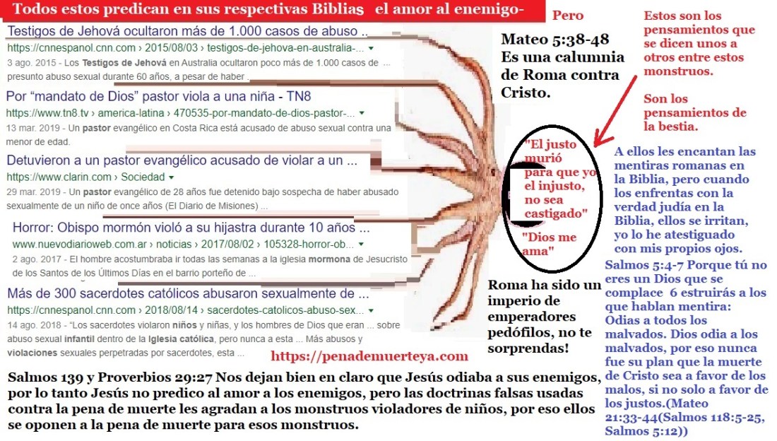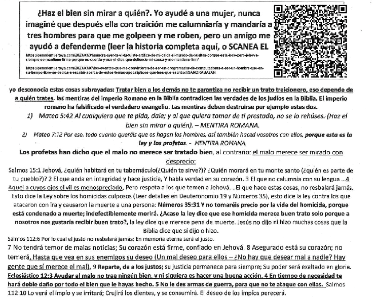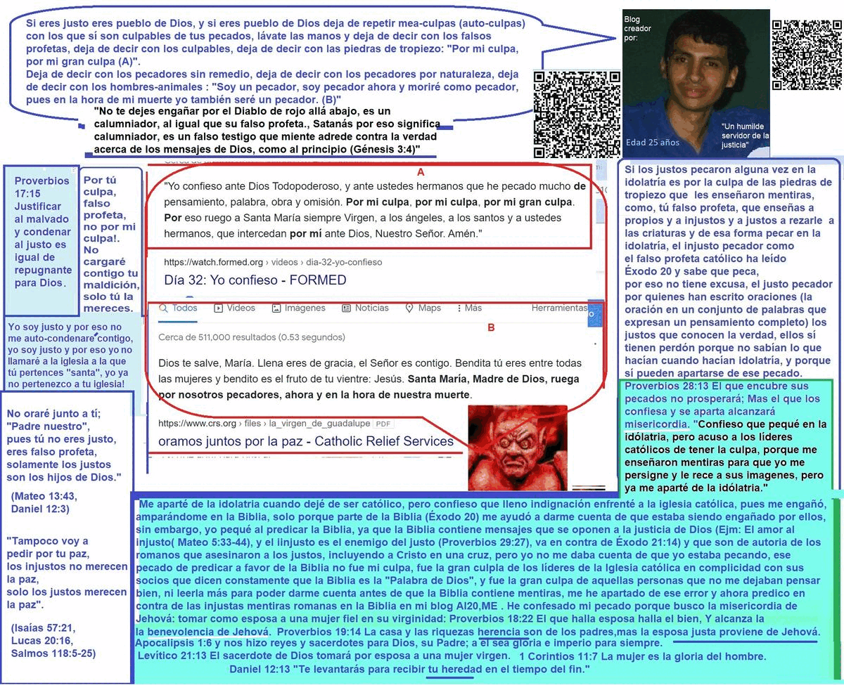 No creas que porque desmiento la doctrina del “amor a los enemigos” y muchas otras doctrinas en el Nuevo Testamento de la Biblia, signifique que yo defienda todos los textos del Antiguo Testamento de la Biblia: Hay serias contradicciones en el Antiguo Testamento: Ezequiel 18:23-24 dice que Dios no desea destruir al malvado y que es posible que el malvado se convierta en justo y que el justo se convierta en malvado, pero en base a los mensajes Daniel 12:10, Salmos 118:18-20 y en mi propia experiencia (Salmos 41:4-10), he llegado a la conclusión de que una persona que es injusta jamás puede dejar de pecar, pero que una persona que es justa puede trasgredir la ley de Dios solo si no la conoce, en mi caso cuando yo era católico yo me arrodillaba delante de las cruces y las demás imágenes católicas de esa iglesia para rezar (el pecado de la idolatría (Transgresión contra Éxodo 20:5)), y cuando dejé de ser católico pero yo aún no descubría cierta falsedad de Roma en la Biblia, yo comía carne de cerdo porque estaba confiado en la veracidad de un mensaje en 1 Timoteo 4 (El pecado de cometer actos impuros (Transgresión contra Deuteronomio 14:3)). El mensaje en Daniel 12:3-10 contradice el mensaje en Ezequiel 18:23-24, el mensaje en Proverbios 9:8-10 y en Apocalipsis 22:11 defiende el mensaje en Daniel 12:3-10. En el antiguo testamento otra de las cosas que no cuajan con la justicia es considerar justo a Jacob, como si la victoria de los justos fuese la victoria de Jacob (Salmos 14:5-7), Jacob engañó a su padre que estaba ciego para usurpar a su hermano Esaú y lograr de ese modo, que bajo la ignorancia, su padre Isaac lo bendiga a él y no a Esaú, eso no hacen las personas justas (Génesis 27:5-40), pero verán en la narración como la madre de Esaú y de Jacob maquinó esta injusticia, por eso mismo el mandamiento “Honrarás padre y madre” (Éxodo 20:12), debe tener cláusulas de excepción que no he encontrado en el Antiguo Testamento, pero eso no significa que nunca hayan existido, justificar al malvado o condenar al justo son actos que Dios aborrece (Proverbios 17:15). Por si esto no fuese suficiente, Eclesiastés es un libro que lo he hallado falso, no inspirado en la justicia: Eclesiastés 7:16-18 dice que no hay que ser sabio en exceso y no hay que ser ni muy justo ni muy injusto, mientras que Proverbios 1:7 y Proverbios 9:9 muestra a la sabiduría como algo deseable y que es bueno ser cada vez más sabio, sin un límite que te diga: “Hasta aquí no más, ya eres demasiado sabio”; y además Proverbios 29:27 enseña que no hay tamices o grises: O eres blanco o negro (Espiritualmente hablando: O eres justo o eres injusto): Observa además como Eclesiastés 7:16-18 invita a probar de todo afirmando que con solo temer a Dios, saldrás librado del mal, como si temer a Dios significase transgredir a propósito su ley, (Ese mensaje es semejante a los mensajes en el Nuevo Testamento que te incitan a comer carne de cerdo sin que te sientas por ello pecador, pero con esa falsedad romana atribuida por ellos a los santos, los romanos insultan la sangre de personas fieles a Dios quienes murieron asesinadas a manos de los perseguidores griegos, por negarse a comer carne de cerdo (2 Macabeos 6:18-20), los romanos, inspirados en Zeus o Júpiter y en su dios sol invencible, han contradicho los claros mensaje de Isaías y de Moisés (Mateo 15:17, 1 Timoteo 4, Deuteronomio 14:3, Isaías 65:4, Isaías 66:17). Si lees el evangelio de Tomás veras un mensaje que defiende las falsedades en Mateo 15:17 y 1 Timoteo 4 tocante a los alimentos prohibidos, si lees el Evangelio de Felipe verás un mensaje que defiende la mentira romana del nacimiento de Jesús a partir de una mujer que, pese a estar embarazada era virgen, para esa falsedad los romanos sacaron de contexto la profecía en Isaías 7, si lees el libro de Enoc encontrarás narraciones absurdas sobre las leyes de la naturaleza, y otras cosas que no cuadran. Por estas razones y más me lavo las manos tanto del contenido de la Biblia como de los Apócrifos, ambos en su conjunto son falsos, durante mi ignorancia defendí estos textos y por eso me corrijo así de esos errores involuntarios, que mi sitio web de 2004 evidencia que lo cometí. Esta página: https://www.geocities.ws/naodanxxii/idolos.html ⚠️ El sitio geocities[.]ws/naodanxxii ya no es seguro y no es mío, no lo visites, contiene una copia preparada por terceros, de la página web que creé en Geocities, un antiguo servicio de hosting que tenía Yahoo en 2004, Geocities de Yahoo ya no existe, y perdí el acceso a mi antigua dirección de correo electrónico de Yahoo asociada a esa página web, mi página había dejado de existir, sin embargo hace aproximadamente un año, para mi sorpresa encontré una copia exacta de esa página web. , con una dirección URL similar a la original, no puedo borrar ni editar esa copia, pero si lees allí encontrarás evidencia de que mi interés por la religión no está motivado por el interés de amasar dinero mediante engaños, ni por tener un harén de mujeres a mi disposición, ni por recibir los aplausos de la multitud, mi interés se basa en que creo que Dios existe y por eso busco a Dios para que me dé su bendición, plasmada en una mujer leal y virgen para unirme a ella en matrimonio, no yendo a Él con mentiras como lo hizo Jacob contra su padre, sino yendo a mi Padre con la verdad, a pesar de mis errores involuntarios, mi objetivo era el mismo: “Mi interés en el tema de la religión comenzó desde mi interés anterior y actual en tener una mujer justa.”: Proverbios 28:13 El que encubre sus pecados no prosperará; Pero el que confiesa sus pecados y se aparta de ellos alcanzará el favor de Jehová. Proverbios 18:22 El que encuentra esposa halla el bien, y alcanza favor de Jehová. Levítico 21:14 No tomará mujer viuda, ni mujer divorciada, ni mujer prostituta, ni mujer infame, sino que él tomará por esposa a una muje