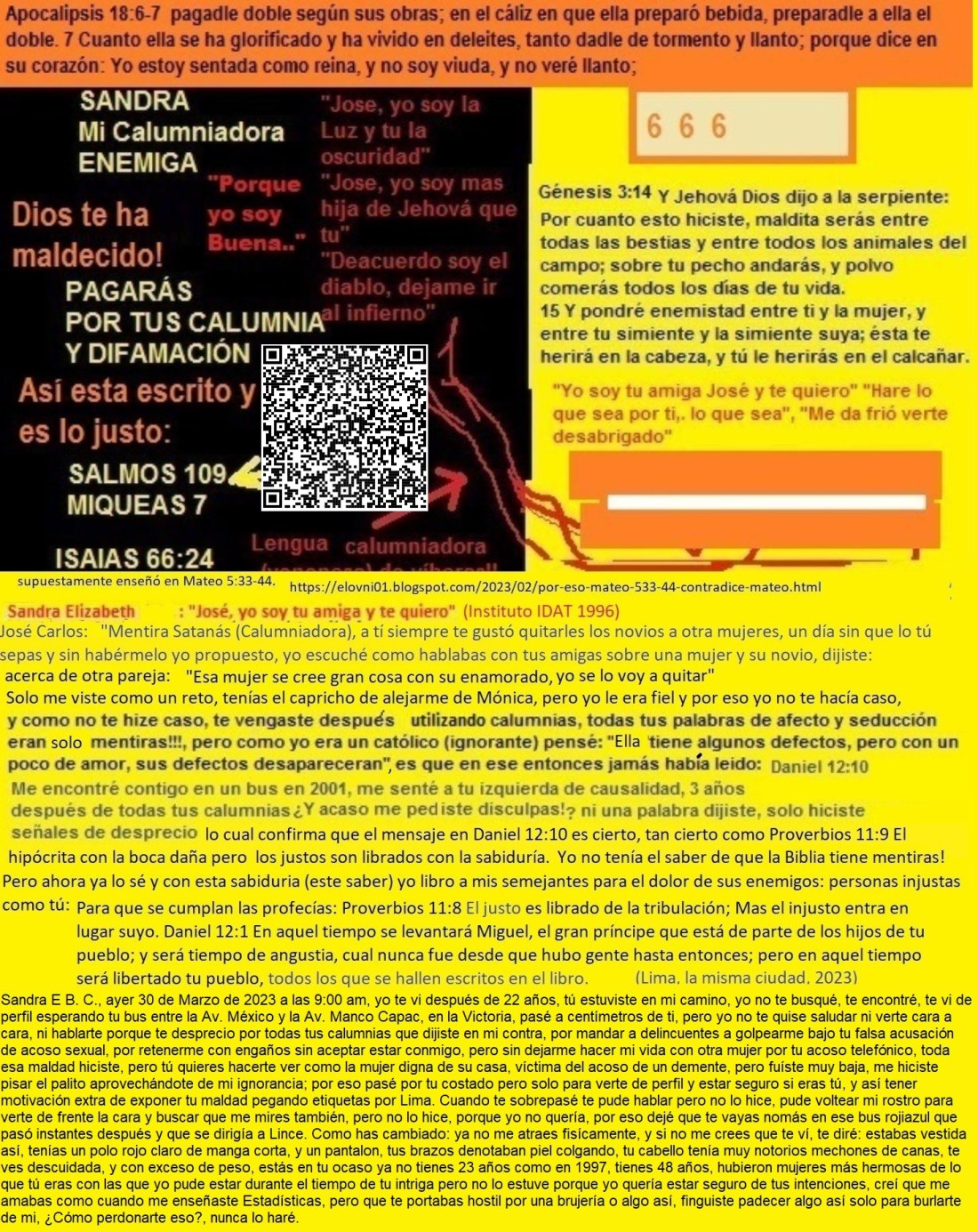Los ladrones suelen usar la estrategia de fingir buenas intenciones: Para robar en tiendas fingen ser clientes, para pedir diezmos fingen predicar la palabra de Dios, pero predican la de Roma, etc. etc. Sandra Elizabeth fingió ser amiga, luego fingió ser una amiga en problemas buscando mi ayuda, pero todo era para calumniarme y emboscarme con tres delincuentes, seguramente por despecho porque un año antes rechacé sus insinuaciones porque estaba enamorado de Mónica Nieves, a quien fui fiel. Pero Mónica no confiaba en mi fidelidad y amenazó con matar a Sandra Elizabeth, por lo que terminé con Mónica lentamente, en ocho meses, para que no creyera que era por Sandra. Pero así me pagó Sandra Elizabeth, con calumnias. Me acusó falsamente de acosarla sexualmente y, con ese pretexto, ordenó a tres delincuentes que me golpearan, todo esto frente a ella.