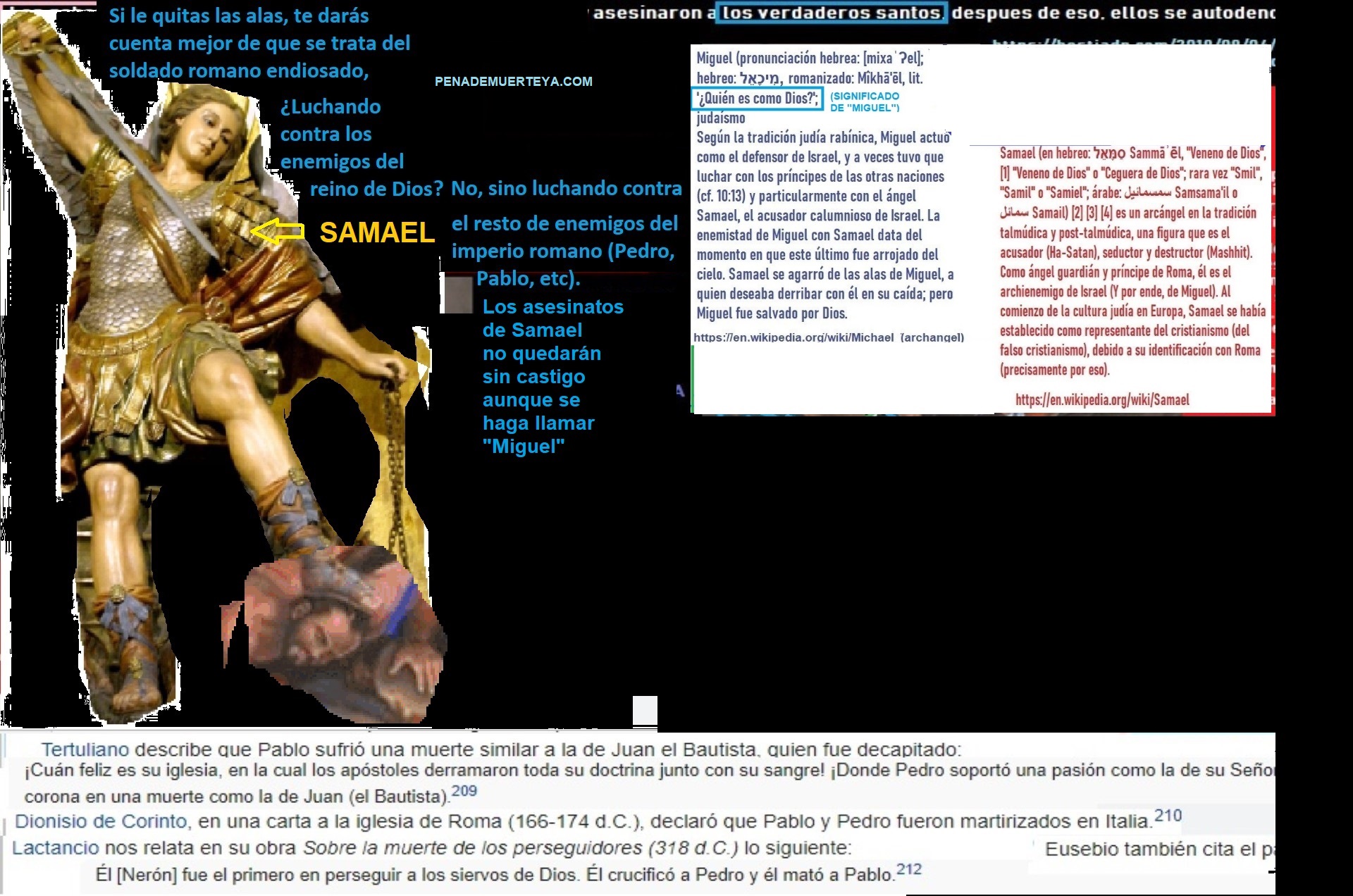 Miguel es el defensor de Israel (de las personas justas de Israel, según Salmos 118:1-20 y Daniel 12:1-3), mientras que Samael es el ángel de Roma, enemigo de Israel. Los romanos no solo cambiaron el nombre de su demonio para llamarlo Miguel, siguiendo su patrón de engaños, sino que también falsificaron muchos textos sagrados. Por eso abundan las contradicciones en la Biblia. Los evangelios apócrifos también contienen algunas de esas mentiras romanas, diseñadas para hacer creer que incluso lo prohibido validaba lo canonizado por Roma, aunque fuese falso por ser de su propia invención.