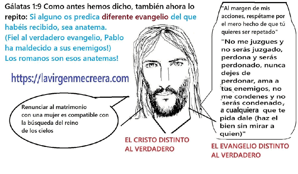 Con estás palabras: Gálatas 1:6-8 Mas si aun nosotros, o un ángel del cielo, os anunciare otro evangelio diferente del que os hemos anunciado, sea anatema. San Pablo se refería a sus perseguidores romanos que después lo asesinarían decapitándolo para destruir el evangelio que el predicaba y anunciar uno diferente, uno reflejado en la Biblia de los romanos, a la cual se convirtieron para no cambiar en lo absoluto su conducta invasora. Los sucesores de esos malvados invasores predican estupideces del imperio romano transformado en el imperio de la falsa religión: