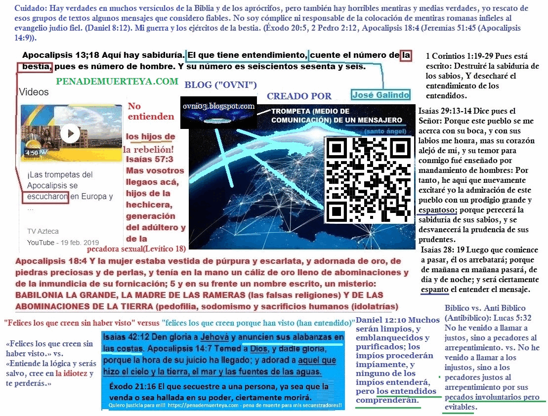 1 Por esta verdad defiendo la pena de muerte https://ntiend.me/2025/05/09/por-esta-verdad-defiendo-la-pena-de-muerte/ 2 Cuando alguien dice que: la Biblia no es contradictoria, sino que la Biblia es palabra infalible de Dios, a menudo lo utilizan como una táctica para evitar el análisis crítico y proteger las versiones de los textos que fueron manipulados o creados por el Imperio Romano. Al desviar el enfoque hacia una supuesta infalibilidad de sus mensajes, buscan impedir cuestionar si ciertos pasajes fueron alterados con el objetivo de imponer una narrativa específica o de beneficiar intereses políticos y religiosos. https://labibliasecontradice.blogspot.com/2024/12/cuando-alguien-dice-que-la-biblia-no-es.html 3 ¿Por qué Dios destruyó Sodoma?, Dios destruyó Sodoma por medio de sus ángeles porque sus habitantes eran malos y no se podían convertir en justos como Lot, el justo. https://144k.xyz/2024/05/02/por-que-dios-destruyo-sodoma-dios-destruyo-sodoma-por-medio-de-sus-angeles-porque-sus-habitantes-eran-malos-y-no-se-podian-convertir-en-justos-como-lot-el-justo/ 4 Videos 451-460 – Al final del conflicto Gabriel se lleva la victoria y Zeús se lleva el dolor, Babilonia también se llama Dolores . https://ntiend.me/2023/02/15/videos-451-460/ 5 Abel, the righteous man the son of Adam (The man) returns and calls his holy messengers with the means of communication at hand (Trumpets), a voice is heard: And why I never understood it, decades reading those texts.., someone replies him: ‘Damien’, you know it now, you just do not need some mirrows to confirm what you are… https://ellameencontrara.com/2023/06/28/abel-the-righteous-man-the-son-of-adam-the-man-returns-and-calls-his-holy-messengers-with-the-means-of-communication-at-hand-trumphets-a-voice-is-heard-and-why-i-never-understood-it-decade/