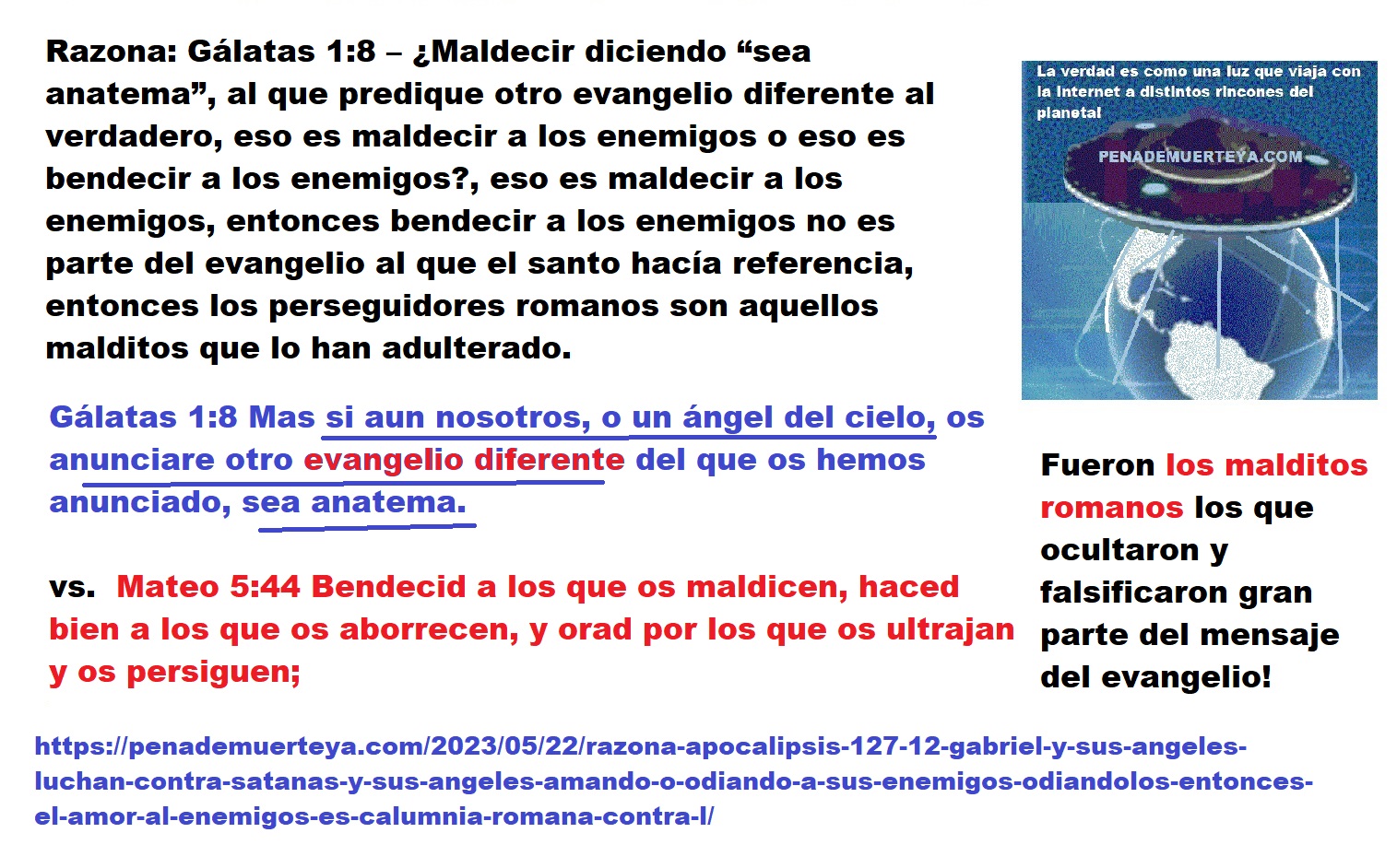 | Razona: Gálatas 1:8 – ¿Maldecir diciendo “sea anatema”, al que predique otro evangelio diferente al verdadero, eso es maldecir a los enemigos o eso es bendecir a los enemigos?, eso es maldecir a los enemigos, entonces bendecir a los enemigos no es parte del evangelio al que el santo hacía referencia, entonces los perseguidores romanos son aquellos malditos que lo han adulterado. | https://ntiend.me/2023/05/22/razona-galatas-18-maldecir-diciendo-sea-anatema-al-que-predique-otro-evangelio-diferente-al-verdadero-eso-es-maldecir-a-los-enemigos-o-eso-es-bendecir-a-los-enemigos-eso-es-maldecir/ |