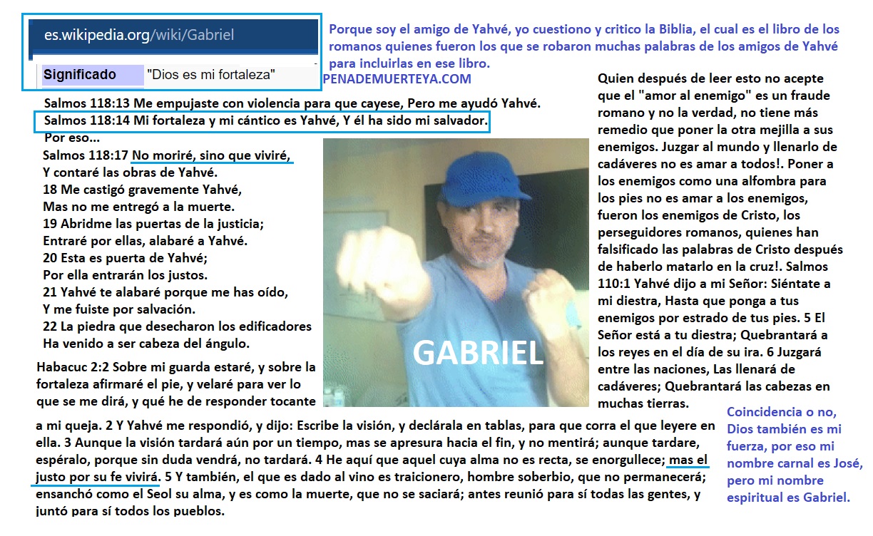 Tengo una crisis de identidad, a veces pienso que soy Miguel, a veces que soy Gabriel, pero eso no me molesta mientras yo sea enemigo de Satanás, mi autopercepción no me impide tener una vida autónoma, pero a quienes les molesta mi alta autoestima son aquellas personas que me calumnian y que, mediante torturas con pastillas para enfermos mentales y secuestros, han intentado destruir para siempre mi salud, mi integridad y mi autonomía.