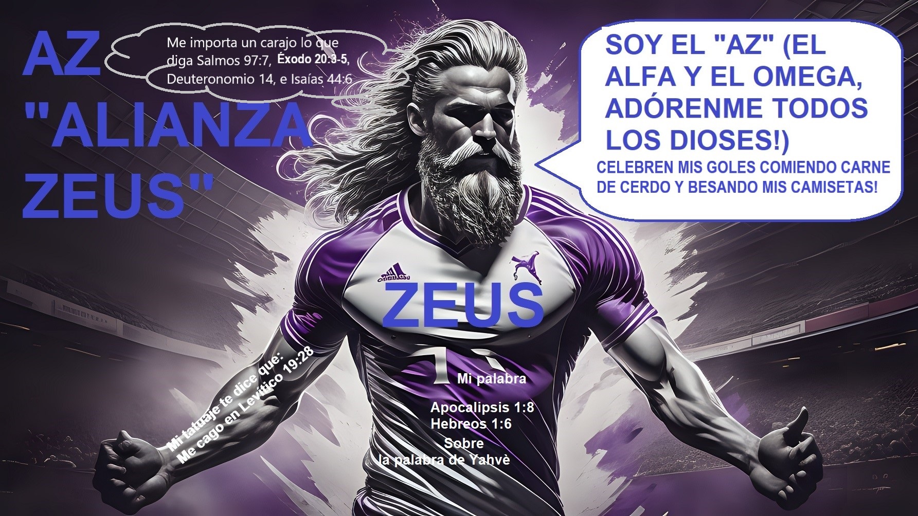Palabras de Zeus: «Soy el AZ (El alfa y el omega), adórenme todos los dioses, celebren mis goles comiendo carne de cerdo y besando mis camisetas.»