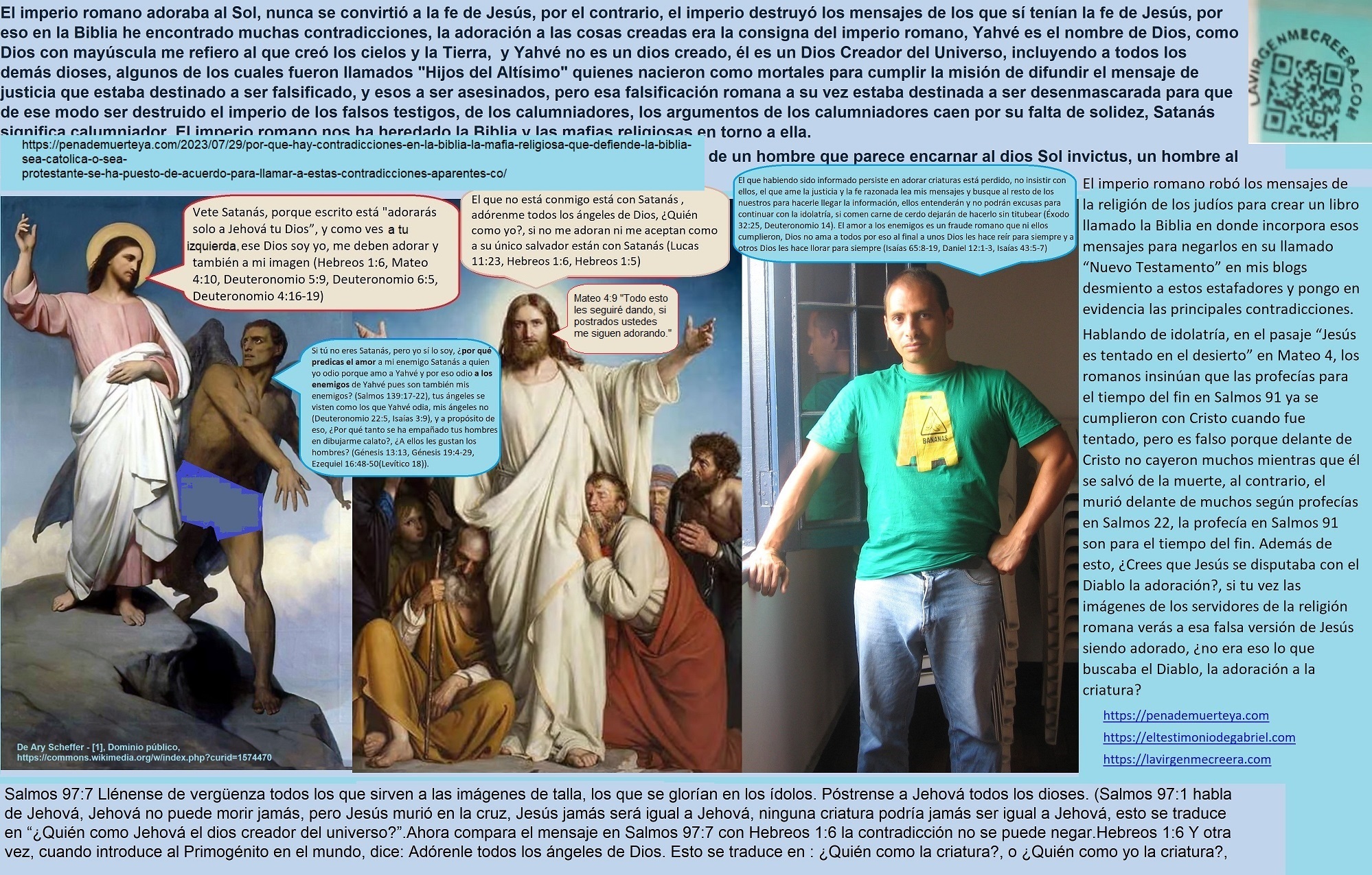 «¿Quién es responsable de la maldad, «»Satanás»» o la persona que comete la maldad? No te dejes engañar por justificaciones estúpidas porque «»el Diablo»» al que culpan de sus propias malas acciones en realidad son ellos mismos. La típica excusa de la persona religiosa perversa: «»Yo no soy así porque no soy yo quien hace este mal, sino el Diablo que me ha poseído quien hace este mal.»» Los romanos, actuando como «»Satanás»», crearon contenido que también hicieron pasar por leyes de Moisés, contenido injusto para desacreditar el contenido justo: La Biblia no solo contiene verdades, también contiene mentiras. Satanás es un ser de carne y hueso porque significa: el calumniador. Los romanos calumniaron a Pablo atribuyéndole la autoría del mensaje de Efesios 6:12. La lucha es contra carne y sangre. Números 35:33 menciona la pena de muerte contra carne y sangre, los ángeles enviados por Dios a Sodoma destruyeron carne y sangre, y no «»huestes espirituales de maldad en las regiones celestiales.»» Mateo 23:15 dice que los fariseos convierten a sus seguidores en personas aún más corruptas que ellos, sugiriendo que alguien puede volverse injusto por influencia externa. En cambio, Daniel 12:10 dice que los injustos seguirán actuando con injusticia porque es su naturaleza, y solo los justos comprenderán el camino de la justicia. La falta de armonía entre estos dos mensajes muestra que algunas partes de la Biblia entran en contradicción, lo que pone en duda su veracidad absoluta. https://naodanxxii.wordpress.com/wp-content/uploads/2025/03/idi01-the-plot.pdf .» «El imperio Romano, Bahira, Mahoma, Jesús y el judaísmo perseguido. El nacimiento y la muerte de cuarta bestia. La alianza greco-romana por los mismos dioses. El Imperio seléucida. Cuidado con creer en el evangelio del anticristo (Buenas noticias para los injustos, aunque falsas) Si quieres salvarte del engaño del adversario de la justicia, considera que: Para rechazar el falso evangelio de Roma, acepte que si Jesús fue justo entonces no amó a sus enemigos, y si no fue hipócrita entonces no predicó el amor a los enemigos porque no predicaba lo que no practicaba: Proverbios 29:27 Los justos odian a los injustos, y los injustos odian a los justos. Esto es parte del evangelio adulterado por los romanos para la Biblia: 1 Pedro 3:18 Porque Cristo murió una vez por los pecados, el justo por los injustos, para llevarnos a Dios. Ahora mire esto que desmiente esa calumnia: Salmo 118:20 Esta es la puerta de Jehová; los justos entrarán por ella. 21 Te daré gracias porque me has escuchado y has sido mi salvación. 22 La piedra que rechazaron los constructores se ha convertido en la piedra angular. Jesús maldice a sus enemigos en la parábola que predice su muerte y regreso: Lucas 20:14 Pero cuando los viñadores vieron esto, discutieron entre sí, diciendo: Éste es el heredero; Venid, matémoslo, para que la herencia sea nuestra. 15 Entonces lo echaron de la viña y lo mataron. ¿Qué les hará entonces el dueño de la viña? 16 Él vendrá y destruirá a estos viñadores y dará la viña a otros. Cuando lo oyeron, dijeron: ¡De ninguna manera! 17 Pero Jesús, mirándolos, dijo: ¿Qué, pues, es esto que está escrito: La piedra que desecharon los constructores se ha convertido en la piedra angular? Él habló de esta piedra, de la piedra de la pesadilla del rey de Babilonia: Daniel 2:31 Tú, oh rey, veías, y he aquí una gran imagen. Esta imagen, que era muy grande, y cuya gloria era muy sublime, estaba en pie delante de ti, y su aspecto era terrible. 32 La cabeza de esta imagen era de oro fino; su pecho y sus brazos, de plata; su vientre y sus muslos, de bronce; 33 sus piernas, de hierro; sus pies, en parte de hierro y en parte de barro cocido. 34 Estabas mirando, hasta que una piedra fue cortada, no con mano, e hirió a la imagen en sus pies de hierro y de barro cocido, y los desmenuzó. 35 Entonces fueron desmenuzados también el hierro, el barro cocido, el bronce, la plata y el oro, y fueron como tamo de las eras del verano, y se los llevó el viento sin que de ellos quedara rastro alguno. Mas la piedra que hirió a la imagen fue hecha un gran monte que llenó toda la tierra. La cuarta bestia es la alianza de los líderes de todas las falsas religiones amigables con el fraude romano denunciado. El Cristianismo y el Islam dominan el mundo, la mayoría de los gobiernos o juran por el Corán o por la Biblia, por ese simple motivo, aunque los gobiernos lo nieguen, son gobiernos religiosos que se someten a las autoridades religiosas que están detrás de esos libros por los cuales juraron. Aquí les voy a mostrar la influencia romana en los dogmas de estas religiones y como distan mucho de los dogmas de la religión que perseguía Roma, Además, lo que les voy a mostrar no es parte de la religión que hoy se conoce como Judaísmo. Y si a esto le sumamos la fraternidad de los líderes del Judaísmo, Cristianismo e Islam, hay suficientes elementos para señalar a Roma como la creadora de los dogmas de estas religiones, y que la última religión mencionada no es la misma que el Judaísmo que perseguía Roma. Sí, estoy afirmando que Roma creó el cristianismo y que persiguió un Judaísmo diferente al actual, los líderes leales del Judaísmo legítimo jamás darían abrazos fraternales a difusores de doctrinas idólatras. Es evidente que no soy cristiano, ¿entonces porque cito pasajes de la Biblia para dar sustento a lo que digo?, pues porque no todo en la Biblia pertenece exclusivamente al cristianismo, parte de su contenido es el contenido de la religión del camino de la justicia que fue perseguido por el imperio romano por ser contrario al ideal romano de hacer que «Todos los caminos conduzcan a Roma (Es decir, que esos caminos favorezcan los intereses imperiales), por eso tomo algunos pasajes de la Biblia para sustentar mis afirmaciones. Daniel 2:40 Y el cuarto reino será fuerte como hier