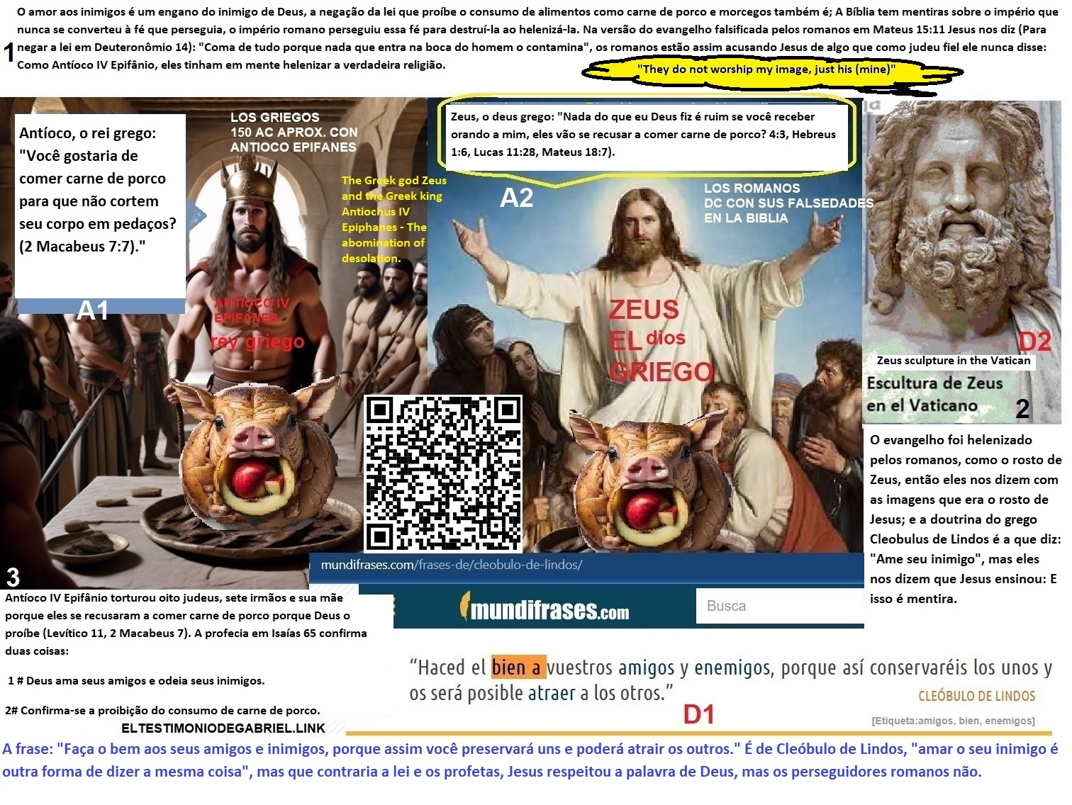 O evangelho foi helenizado pelos romanos, como o rosto de Zeus, então eles nos dizem com as imagens que era o rosto de Jesus; e a doutrina do grego Cleobulus de Lindos é a que diz: «Ame seu inimigo», mas eles nos dizem que Jesus ensinou: E isso é mentira.