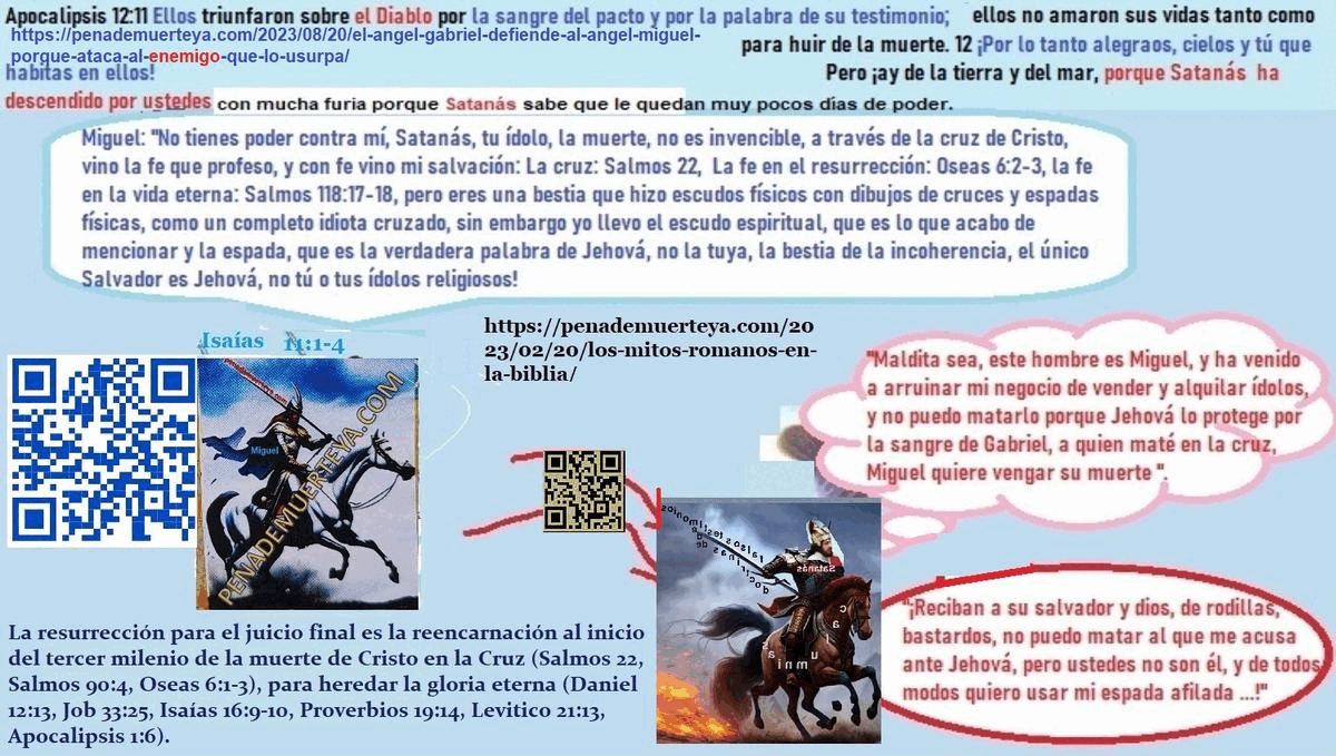 Y el ángel Miguel diría: “Samael es mi enemigo y lo odio, por eso ataco a capa y espada la credibilidad en las palabras de Satanás en ese libro, palabras que indican que no debo odiarlo (Mateo 5:38), las cuales indican que el se puede convertir en bueno y que Dios no desea darle muerte (Ezequiel 18:23), pero si yo no odiase a Satanás, ¿Cómo yo libraría una guerra contra Satanás (Apocalipsis 12:7-9)?, con calumnias Satanás se ha dedicado a contradecir las palabras de la justicia (Eclesiástico 12:6 También Dios aborrece a los malvados y les dará su castigo. Daniel 12:10 Los malvados nunca dejarán de ser malvados. Salmos 5:6-7 Dios odia a los malvados y los destruirá. Salmos 139:19 Dios hará morir a los malvados))!».