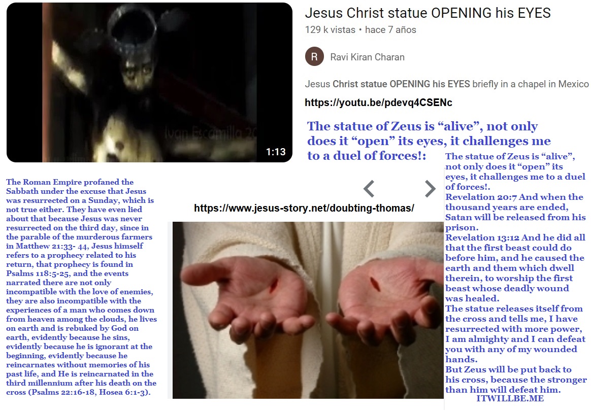 Nos engañaron: «Jesús no resucitó al tercer día», Oseas 6: 1-3 habla de más de una sola persona y habla de volver a vivir después de 2 días; pero se refiere al 3er milenio porque un día equivale a 1000 años en muchas profecías (Salmos 90:4), por lo tanto, afirmar que los justos vuelven a vivir después de dos días, equivale a afirmar que ellos vuelven a vivir después de dos mil años después de un evento especial, ese evento especial es la muerte de Jesús en la cruz a favor de ellos, los escogidos (Salmos 22, Salmos 118:20), esto es el tercer milenio, ese tiempo es este y coincide con era de la Internet, y solo con esta tecnología es posible que se cumpla la profecía en Isaías 42:1-4 porque hay que juzgar sin alzar la voz en las calles, y a naciones lejanas, y hacerlo hasta hacer triunfar la justicia, la profecía del juicio final en Isaías 42 y Salmos 110 es posible solo con la Internet, se juzga con palabras, y Dios usa a sus mensajeros para transmitirlas en el tiempo del juicio final (1 Corintios 6:2, Ezequiel 23:25), la expresión estar en el cielo significa estar a la diestra de Dios, y hay más de uno en el cielo en el tiempo del fin (Salmos 110:1-3, Isaías 51:12-16, Salmos 118:6-7, Apocalipsis 12:10). El regreso de Jesús desde el cielo que contiene los vientos y las nubes y con el mismo cuerpo restaurado y los mismos recuerdos que Jesús tuvo hace dos mil años es incompatible con las profecías en Salmos 118 a la que Jesús hizo referencia en la parábola de los labradores malvados (Mateo 21:33-43), repito: solo por medio de la internet es posible juzgar al mundo sin levantar las voz en las calles y plazas, la internet hace posible juzgar a naciones distantes a la velocidad del relámpago, como dice la parábola sobre el regreso de Cristo (Mateo 22:47), en una guerra la trompeta es un medio de comunicación porque emite un mensaje (Apocalipsis 12:7), así los mensajes que difunden los mensajeros justos son armas de guerra contra los mensajeros malvados quienes difunden de manera intencional mensajes falsos contra el verdadero mensaje de Dios, esas mentiras están enquistadas en la Biblia, y son obra de las manos corruptas del imperio romano contra el mensaje de los escogidos: Mateo 24:1-49 y Hechos 1:26-27 nos dicen que después de morir Jesús resucitó al tercer día y luego de unos 40 días el se elevó levitando al cielo en vista de varios testigos, pero eso es falso; los romanos han hecho pasar algunas profecías pendientes para el tiempo del fin como profecías ya cumplidas (Por ejemplo Salmos 109 y Salmos 91), ellos inventaron la existencia de un traidor como Judas Iscariote, para decir que la maldición en la profecía Salmos 109 se cumplió contra él, pero esa profecía se trata de una profecía a cumplirse en simultáneo con aquellas en Salmos 118, y Salmos 112 y que son para el tiempo del fin al igual que Isaías 42; la profecía sobre el traidor dice que el traicionado confiaba en el traidor, y contextuando Salmos 41 hay más de un traidor; Salmos 41 también se trataría de una profecía para el tiempo del fin, lo mismo que la de Salmos 109, Salmos 118, Miqueas 7:5-13 y Daniel 12:1-3. Según la versión romana de los hechos de Jesús (Juan 6:64), el ya sabía de antemano quién lo iba a traicionar porque el no era un ser humano común con los 5 sentidos básicos que tengo yo por ejemplo, sino un ser con superpoderes sensoriales, nadie confía en aquel de quién de antemano ya sabe que es un traidor, y la profecía en Salmos 41, a la que los romanos han querido hacer pasar por profecía cumplida con Cristo, dice con claridad que la víctima de la traición confiaba en el traidor. El regreso de Jesús no es el mismo cuerpo de su primera vida porque no resucitó, su cuerpo se hizo polvo, la profecía que dice que el santo mensajero de Dios no verá corrupción corporal es una profecía relacionada con la vida eterna para los justos cuando ellos vuelvan a la vida para heredar la inmortalidad, el honor y la gloria (Daniel 7:1-27, Salmos 118:17-20, Salmos 16:10, Daniel 12:1, Proverbios 19:14, Job 33:25, Levítico 21:13), el único modo de hacerlo es por medio de la reencarnación pues Salmos 118 hace evidente que ellos tienen que ser reprendidos porque no conocen la verdad durante un tiempo ya que deben conocer la sabiduría para librarse de la gran tribulación (Proverbios 11:8-9, El anciano de Días representa la sabiduría: con sabiduría los santos destruyen a la cuarta bestia: el imperio mundial dirigido por los falsos profetas quienes en torno al Cesar consultan unidos contra Dios y contra su pueblo escogido (Salmos 2; Apocalipsis 19:19-21). La mentira romana en Hechos 1: 1-26 es incongruente con la verdad Mateo 21: 33-44 (Salmos 118: 7-23). Los romanos han destruido casi totalmente el evangelio y la Biblia representa esa burla romana contra Dios, pero las profecías verdaderas no dejan de ser eso y se cumplen por ese mismo motivo, y Yahvé, el dios de los justos, demostrará con sus hechos que solo ama a sus amigos y que solo odia a sus enemigos.
