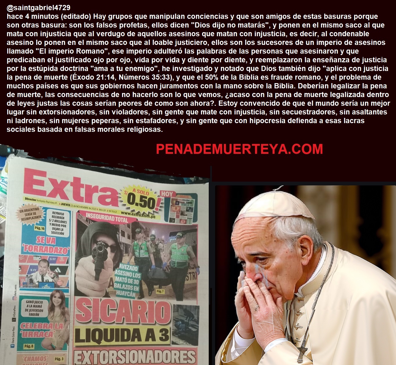 Hay grupos que manipulan conciencias y que son amigos de estas basuras porque son otras basura: son los falsos profetas, ellos dicen «Dios dijo no matarás», y ponen en el mismo saco al que mata con injusticia que al verdugo de aquellos asesinos que matan con injusticia, es decir, al condenable asesino lo ponen en el mismo saco que al loable justiciero, ellos son los sucesores de un imperio de asesinos llamado «El imperio Romano», ese imperio adulteró las palabras de las personas que asesinaron y que predicaban el justificado ojo por ojo, vida por vida y diente por diente, y reemplazaron la enseñanza de justicia por la estúpida doctrina «ama a tu enemigo», he investigado y notado que Dios también dijo «aplica con justicia la pena de muerte (Éxodo 21:14, Números 35:33), y que el 50% de la Biblia es fraude romano, y el problema de muchos países es que sus gobiernos hacen juramentos con la mano sobre la Biblia. Deberían legalizar la pena de muerte, las consecuencias de no hacerlo son lo que vemos, ¿acaso con la pena de muerte legalizada dentro de leyes justas las cosas serían peores de como son ahora?. Estoy convencido de que el mundo sería un mejor lugar sin extorsionadores, sin violadores, sin gente que mate con injusticia, sin secuestradores, sin asaltantes ni ladrones, sin mujeres peperas, sin estafadores, y sin gente que con hipocresia defienda a esas lacras sociales basada en falsas morales religiosas.