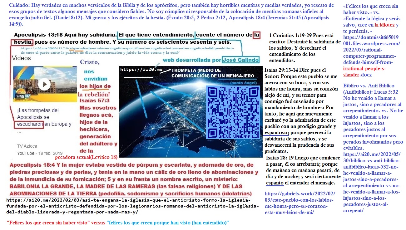 En Apocalipsis 6:10 no existe amor a los enemigos porque revela que Babilonia (Roma) ha falsificado las palabras de los santos. – «La pena de muerte» vs. «Ama a tu enemigo», El Diablo: «Ama a tu enemigo», Yo: «No lo haré porque esa no es palabra de Dios sino de su enemigo el Diablo que lo calumnió». Deuteronomio 19:18 Y los jueces inquirirán bien; y si aquel testigo resultare falso, y hubiere acusado falsamente a su hermano, 19 entonces haréis a él como él pensó hacer a su hermano; y quitarás el mal de en medio de ti. 20 Y los que quedaren oirán y temerán, y no volverán a hacer más una maldad semejante en medio de ti. 21 Y no le compadecerás; vida por vida, ojo por ojo, diente por diente, mano por mano, pie por pie. «Soy el héroe de la princesa y eso le molesta al villano de escamas al cual le digo: «Aleja tus estatuas de ella, ¡infeliz idólatra rebelde!, la ley de mi Dios dice: Éxodo 20:5 No te inclinarás a las imágenes, ni las honrarás; porque yo soy Jehová tu Dios celoso. Y como no has respetado este mandamiento, has falsificado el evangelio, por eso la Biblia tiene mentiras de Roma, con las cuales a ella no la engañarás, serpiente antigua!!, la virgen justa creerá en mi testimonio y no en tus calumnias» https://eltestimoniodegabriel.link https://lavirgenmecreera.com) La revelación del fin de los tiempos: Daniel 12:9-10 Él respondió: Anda, Daniel, pues estas palabras están cerradas y selladas hasta el tiempo del fin (Apocalipsis 10:5-7, Daniel 12:7). Muchos justos serán limpios [de sus pecados], y emblanquecidos y purificados [Proverbios 28:13, Salmos 112:4, Deuteronomio 14, Salmos 118:13-20]; los malvados procederán con maldad, y ninguno de los malvados entenderá (Proverbios 11:9), pero los justos comprenderán (Proverbios 11:8, Isaías 11:4). Proverbios 28:5 Los malvados no entienden el juicio; Pero los que buscan a Jehová sí lo entienden. El Apocalipsis: La virgen creerá el mensaje del ángel Gabriel y así será la derrota de la Serpiente. Eclesiástico 12:1 Cuando hagas el bien, presta atención a quién, y podrás esperar algo de tu buena acción. 2 Haz un favor a una persona buena y recibirás la recompensa, si no de él, al menos del Señor. 3 Ayudar al malo no trae ningún bien, y ni siquiera es hacer una buena acción. 4 En el momento de necesidad, os hará doble daño por todo el bien que le habéis hecho. 5 No le deis armas de guerra, no sea que os ataque con ellas. Creo que existe Dios y también creo que existe gente como yo, pero no me adoro a mí mismo ni tampoco adoro a las personas que son como yo, ni adoro a criatura alguna, por eso soy henoteísta, si buscas su significado en el diccionario sabrás el buen concepto que tengo de mí mismo, motivo de muchas envidias y calumnias, por cierto. (Apocalipsis 14:3 Y cantaban un cántico nuevo delante del trono y delante de los cuatro seres vivientes y de los ancianos; y nadie podía aprender el cántico, sino los ciento cuarenta y cuatro mil que habían sido rescatados de la tierra. https://itwillbe.me Daniel 12:10 Muchos serán limpios, y emblanquecidos y purificados; los impíos procederán impíamente, y ninguno de los impíos entenderá, pero los entendidos comprenderán. Este mensaje está dirigido a esos justos, a esa gente como yo, a esos 144000, ellos entienden de justicia: «Entiéndeme!»- https://penademuerteya.com )