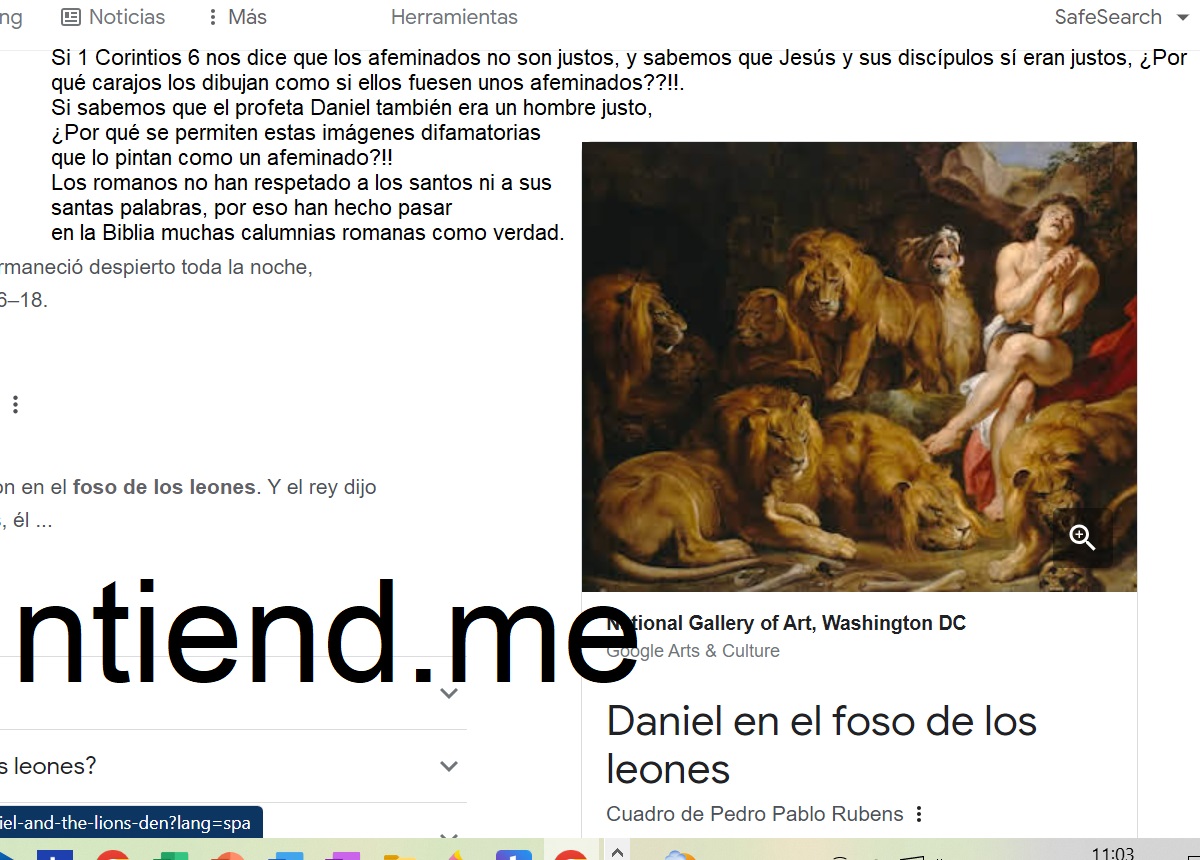 Si 1 Corintios 6 nos dice que los afeminados no son justos, y sabemos también que el profeta Daniel también era un hombre justo, ¿Por qué se permiten estas imágenes difamatorias y calumniosas que lo pintan como un afeminado?!! Los romanos no han respetado a los santos ni a sus santas palabras, por eso han hecho pasar en la Biblia muchas calumnias romanas como verdad. Con mi trabajo yo defiendo el honor de los justos, ya que yo soy uno de ellos y no soy como ese!. Yo soy como Daniel, pero no como ese hombre abajo que no lo representa!: