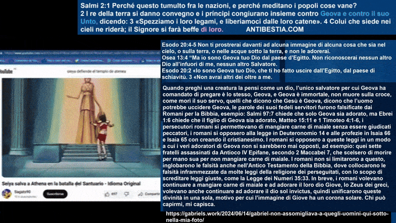 Gabriele è l’angelo del cielo, uno dei santi: il beato angelo del cielo che predica un vangelo diverso e annuncia un Cristo diverso, sì, ma diverso dal falso vangelo dell’impero romano, e diverso da Zeus, il dio nascosto dell’impero romano, usurpatore di Cristo. Usurpato che parla attraverso i servi di Zeus, l’angelo del cielo è servitore di Geova e non degli dei creati. Galati 1:8-11, Daniele 8:25 Con la sua sagacia farà prosperare l’inganno nelle sue mani; e nel suo cuore magnificherà se stesso, e senza preavviso ne distruggerà molti; ed egli insorgerà contro il Principe dei principi, ma sarà spezzato, anche se non da mano d’uomo. Daniele 7:25 E proferirà parole contro l’Altissimo, e distruggerà i santi dell’Altissimo, e penserà di cambiare i tempi e la legge; e saranno consegnati nelle sue mani fino a un tempo, dei tempi e la metà di un tempo. 26 Ma il giudice siederà e il suo dominio gli sarà tolto, affinché sia distrutto e rovinato fino alla fine, 27 e affinché il regno, il dominio e la maestà dei regni che sono sotto tutto il cielo siano dato al popolo dei santi dell’Altissimo, il cui regno è un regno eterno, e tutti i domini lo serviranno e gli obbediranno.