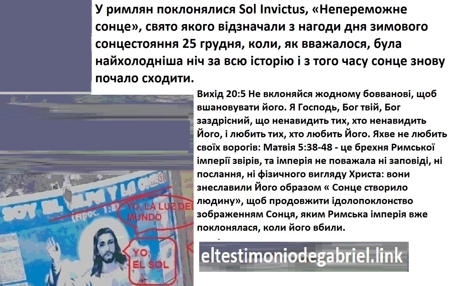 Вихід 20:3 «Хай не буде в тебе інших богів переді Мною.» Вони молилися богам, тому коли створіння моляться, у них є інші боги. Вихід 20:4-5 «Не роби собі різьбленого ідола чи будь-якого зображення того, що на небі (птахи, місяць, сонце тощо), на землі (люди, змії, золоті телята, пірит (пірит – це мінерал, який має форму куба) тощо) або у водах (риби тощо).» Левіт 26:1 Не робіть собі ідолів або різьблених зображень, не ставте собі статуй і не кладіть розмальованих каменів у вашій країні для поклоніння; бо Я Господь, ваш Бог. Коли людина стає на коліна перед зображенням, щоб молитися або вшановувати його, тоді ця людина поклоняється цьому зображенню, зображення стає її ідолом. Тому Бог схвалив, щоб цар Єзекія знищив мідного змія, якого Бог наказав Мойсею зробити, оскільки Бог почав наказувати робити певні зображення для певних цілей, Бог ніколи не наказував, щоб ці зображення поклонялися. 2 Царів 18:4 Він знищив висоти, розбив зображення, вирубав символи Ашери і розтрощив мідного змія, якого Мойсей зробив; бо до того часу ізраїльтяни спалювали йому кадило; і назвав його «предметом з міді». Пам’ятаймо, що спочатку була Біблія, а потім Коран, але ще до існування обох книг пророк Ісая, пророк юдаїзму, написав багато пророцтв. Біблія та Коран поділяють спільну брехню, яка доводить їх римське походження. Біблія каже, що ангел Гавриїл оголосив, що Ісус народиться від діви, щоб виконати пророцтво Ісаї, і Коран також каже, що ангел Гавриїл оголосив про дівоче народження Ісуса. Але це не так, бо Ісая пророкував народження вірного царя, який зруйнував мідного змія, зробленого Мойсеєм, бо ця істота була ідолом. Крім того, Ісая ніколи не казав, що жінка залишиться дівою навіть після того, як завагітніє, щоб народити царя Єзекію, сина Ахаза, Бог був з Єзекією та його вірними слугами, тому Єзекія був Еммануїлом (Читайте Ісая 7 і поєднуйте з 2 Царів 18).