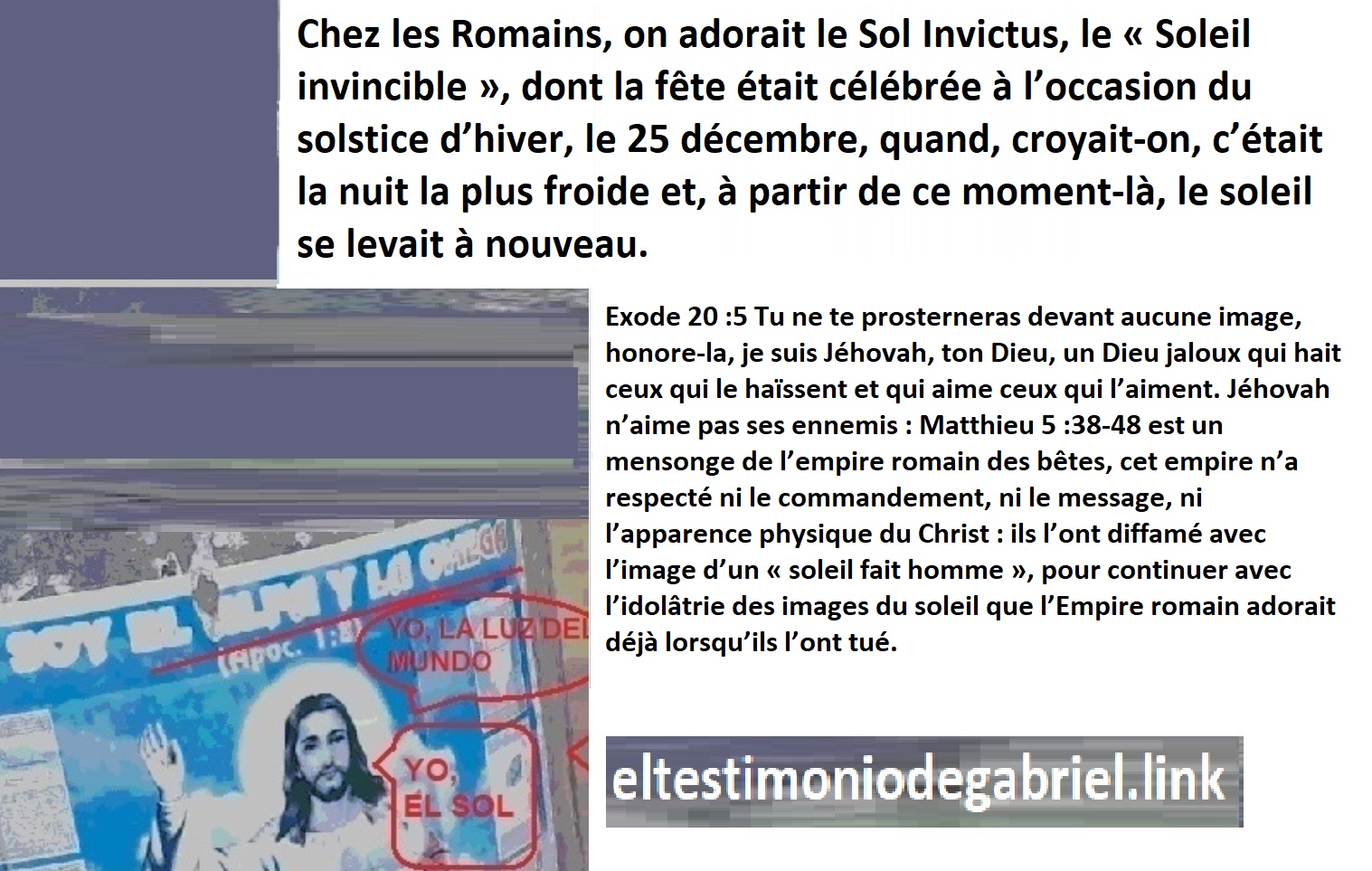 Démontrant que l’Empire romain a créé le Christianisme et l’Islam : Ils ont pour dénominateur commun l’idolâtrie et la tromperie, ils ont besoin de gens soumis à diverses images pour remplir leurs poches. Sans idolâtrie, il n’y a pas de commerce, comme dans le football professionnel qui n’est pas un sport pour tous, c’est une expectative passive de voir comment les autres gagnent de l’argent et font du sport, à tes frais et à ceux de ton sédentarisme.