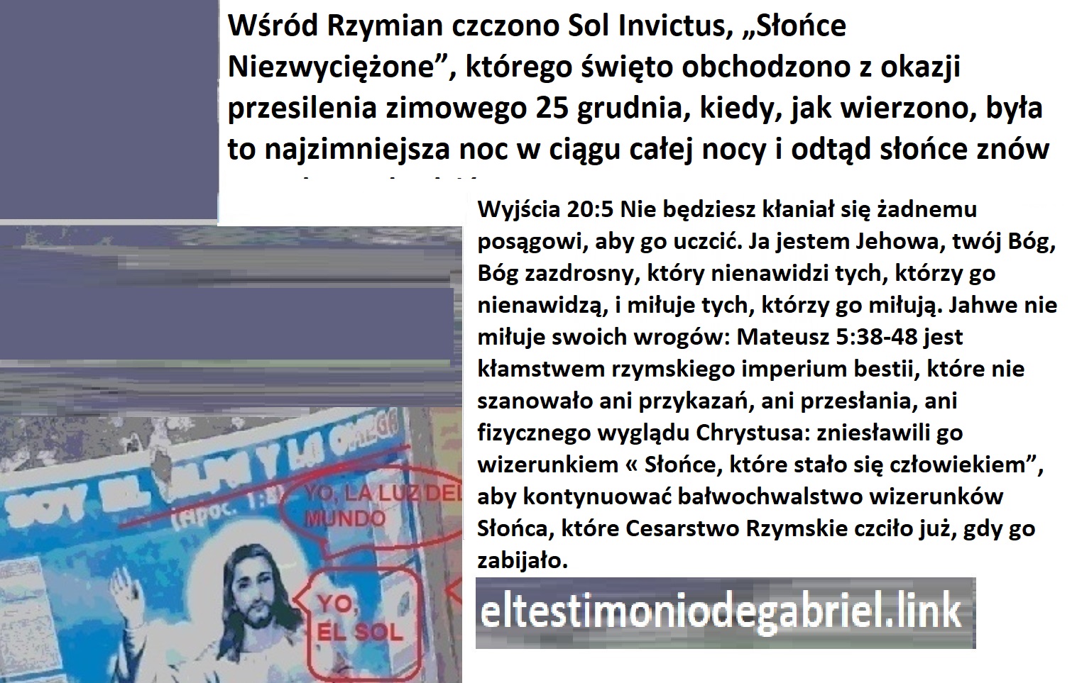 Wykazanie, że Cesarstwo Rzymskie stworzyło chrześcijaństwo i islam: ich wspólnym mianownikiem jest bałwochwalstwo i oszustwo, do napełnienia kieszeni potrzebują ludzi podporządkowanych różnym obrazom. Bez bałwochwalstwa nie ma biznesu, jak w wypożyczanej piłce nożnej, która nie jest sportem dla każdego, jest to bierne oczekiwanie na to, jak inni zarabiają pieniądze i sport, kosztem twoich pieniędzy i siedzącego trybu życia. 2 Mojżeszowa 20:3 „Nie będziesz miał bogów cudzych przede mną. Modlili się do bogów, dlatego kiedy stworzenia się modlą, mają innych bogów. Wyjścia 20:4-5 „Nie będziesz kłaniał się przed obrazem czegokolwiek, co jest w niebie (ptaki, księżyc, słońce itp.), na ziemi (ludzie, węże, złote cielce, piryt (piryt jest minerałem mającym w kształcie sześcianu) itp. lub w wodzie (ryby itp.). 3 Mojżeszowa 26:1 Nie będziesz czynił bożków ani posągów, nie będziesz stawiać posągów i nie będziesz kładł na ziemi malowanych kamieni, aby im oddawać pokłon; bo ja jestem Jehowa, twój Bóg. Kiedy ktoś klęka przed obrazem, aby się pomodlić lub złożyć mu hołd, wówczas ta osoba oddaje cześć temu obrazowi, a obraz staje się jego bożkiem. Właśnie dlatego Bóg zatwierdził, aby król Ezechiasz zniszczył węża z brązu, którego sporządzenie nakazał Mojżeszowi. Ponieważ Bóg zaczął nakazywać tworzenie określonych wizerunków do określonych zastosowań, Bóg nigdy nie nakazał, aby wizerunki te były oddawane czci. 2 Królów 18:4 Usunął wyżyny, potłukł posągi, wyciął symbole Aszery i potłukł węża miedzianego, którego sporządził Mojżesz; bo do tego czasu synowie izraelscy palili mu kadzidło; i nazwał go „przedmiotem z mosiądzu”. Pamiętajmy, że najpierw istniała Biblia, a potem Koran, ale zanim powstały obie księgi, Izajasz, prorok judaizmu, napisał wiele proroctw. Biblię i Koran łączy wspólne kłamstwo, które potwierdza ich rzymskie pochodzenie. Biblia mówi, że anioł Gabriel zapowiedział, że Jezus urodzi dziewicę, aby wypełnić proroctwo Izajasza, a Koran mówi również, że anioł Gabriel zapowiedział narodziny Jezusa z dziewicy. Nie jest to jednak prawdą, ponieważ Izajasz przepowiedział narodziny lojalnego króla, który złamał miedzianego węża stworzonego przez Mojżesza, ponieważ stworzenie to było bożkiem. Co więcej, Izajasz nigdy nie powiedział, że kobieta pozostanie dziewicą nawet po zajściu w ciążę, aby urodzić króla Ezechiasza, syna Achaza, Bóg był z Ezechiaszem i jego wiernymi sługami, dlatego Ezechiasz był Immanuelem (przeczytaj Izajasza 7 i połącz z 2 Królów 18).