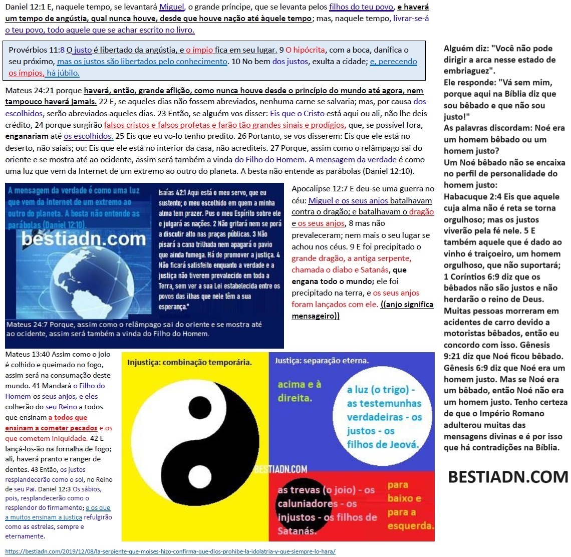 «Quem é responsável pelo mal, «»Satanás»» ou a pessoa que comete o mal? Não se deixe enganar por justificativas estúpidas, pois «»o Diabo»» que eles culpam por suas próprias ações malignas são, na verdade, eles mesmos. A desculpa típica da pessoa religiosa perversa: «»Eu não sou assim porque não sou eu quem faz esse mal, é o Diabo que me possui que faz esse mal.»» Os romanos, agindo como «»Satanás»», criaram conteúdos que também fizeram passar como leis de Moisés, conteúdos injustos para desacreditar conteúdos justos: A Bíblia não contém apenas verdades, também contém mentiras. Satanás é um ser de carne e osso porque significa: o caluniador. Os romanos caluniaram Paulo ao atribuir-lhe a autoria da mensagem de Efésios 6:12. A luta é contra carne e sangue. Números 35:33 menciona a pena de morte contra carne e sangue, os anjos enviados por Deus a Sodoma destruíram carne e sangue, e não «»hostes espirituais da maldade nas regiões celestiais»». Mateus 23:15 afirma que os fariseus tornam seus seguidores ainda mais corruptos do que eles próprios, sugerindo que alguém pode se tornar injusto devido a uma influência externa. Por outro lado, Daniel 12:10 afirma que os injustos continuarão a agir injustamente porque essa é a sua natureza, e apenas os justos compreenderão o caminho da justiça. A falta de harmonia entre essas duas mensagens mostra que algumas partes da Bíblia se contradizem, colocando em dúvida sua veracidade absoluta. https://naodanxxii.wordpress.com/wp-content/uploads/2025/03/idi05-the-plot.pdf .» «O Império Romano, Bahira, Maomé, Jesus e o judaísmo perseguido. Mensagem introdutória: Veja no que acreditavam aqueles que se recusaram a comer carne de porco, apesar de terem sido torturados pelo Rei Antíoco IV Epifânio, um rei adorador de Zeus. Veja como o idoso Eleazar, junto com sete irmãos e sua mãe, foram assassinados pelo rei grego Antíoco por se recusarem a comer carne de porco. Deus foi cruel o suficiente para abolir uma lei que Ele mesmo estabeleceu e pela qual aqueles judeus fiéis ofereceram suas vidas na esperança de receber a vida eterna por meio daquele sacrifício? Deus não é cruel, caso contrário Deus não seria o melhor. Deus não é amigo dos maus, caso contrário Deus seria cruel e parte do problema, não da solução. Aqueles que aboliram essa lei não foram Jesus nem seus discípulos. Eles eram romanos que tinham os mesmos deuses que os gregos: Júpiter (Zeus), Cupido (Eros), Minerva (Atena), Netuno (Poseidon), Tanto os romanos quanto os gregos apreciavam carne de porco e frutos do mar, mas os judeus fiéis rejeitavam esses alimentos. 2 Macabeus 7:1 Sete irmãos e sua mãe foram presos. O rei queria forçá-los a comer carne de porco, o que era proibido por lei, batendo neles com chicotes e tendões de boi. 2 Um deles falou em nome de todos os irmãos, dizendo: “O que vocês querem saber ao nos interrogar? Estamos prontos para morrer em vez de quebrar as leis dos nossos ancestrais.” 8 Ele respondeu em sua língua nativa: “Não comerei carne de porco!” Então ele também foi submetido ao tormento. 9 Mas, ao expirar, disse: Tu, criminoso, tira-nos a vida presente. Mas Deus nos ressuscitará, a nós que morremos segundo suas leis, para a vida eterna. Mensagem: O nascimento e a morte do quarto animal. A aliança greco-romana pelos mesmos deuses. O Império Selêucida. Cuidado para não crer no evangelho do anticristo (Boas novas para os injustos, embora falsas) Se você quer se salvar do engano do adversário da justiça, considere que: Para rejeitar o falso evangelho de Roma, aceite que se Jesus era justo, então Ele não amava Seus inimigos, e se Ele não era hipócrita, então Ele não pregou o amor aos inimigos porque Ele não pregou o que Ele não praticava: Provérbios 29: 27 Os justos odeiam os injustos, e os injustos odeiam os justos. Esta é parte do evangelho adulterado pelos romanos para a Bíblia: 1 Pedro 3:18 Porque Cristo morreu uma única vez pelos pecados, o justo pelos injustos, para levar-nos a Deus. Agora veja isto que desmente essa calúnia: Salmo 118:20 Esta é a porta do Senhor; os justos entrarão nela. 21 Eu te darei graças porque me ouviste e foste a minha salvação. 22 A pedra que os construtores rejeitaram tornou-se a pedra angular. Jesus amaldiçoa seus inimigos na parábola que prevê sua morte e retorno: Lucas 20:14 Mas os lavradores da vinha, vendo isto, arrazoaram entre si, dizendo: Este é o herdeiro; vinde, matemo-lo, para que a herança seja nossa. 15 Então o expulsaram da vinha e o mataram. O que o dono da vinha fará com eles então? 16 Ele virá e destruirá esses arrendatários e dará a vinha a outros. Quando ouviram isso, eles disseram: “Certamente que não!” 17 Mas Jesus olhou para eles e disse: “O que significa então isto que está escrito: ‘A pedra que os construtores rejeitaram tornou-se a pedra angular’?” Ele falou desta pedra, a pedra do pesadelo do rei da Babilônia: Daniel 2:31 Enquanto olhavas, ó rei, eis que uma grande estátua estava diante de ti, uma estátua grandíssima, cuja glória era sobremaneira excelente; sua aparência era assustadora. 32 A cabeça da imagem era de ouro fino, o peito e os braços de prata, o ventre e as coxas de bronze, 33 as pernas de ferro e os pés em parte de ferro e em parte de barro. 34 Enquanto vocês observavam, uma pedra foi cortada, sem auxílio de mãos, e feriu os pés da estátua de ferro e de barro, quebrando-os em pedaços. 35 Então o ferro, o barro, o bronze, a prata e o ouro foram quebrados em pedaços e se tornaram como palha das eiras no verão; o vento os levou embora, sem deixar vestígios deles. Mas a pedra que atingiu a estátua tornou-se uma grande montanha e encheu toda a terra. A quarta besta é a aliança dos líderes de todas as religiões falsas, favoráveis à denunciada fraude romana. O cristianismo e o islamismo dominam o mundo, a maioria dos governos jura pelo