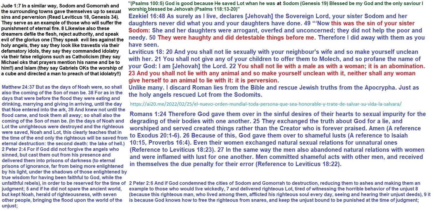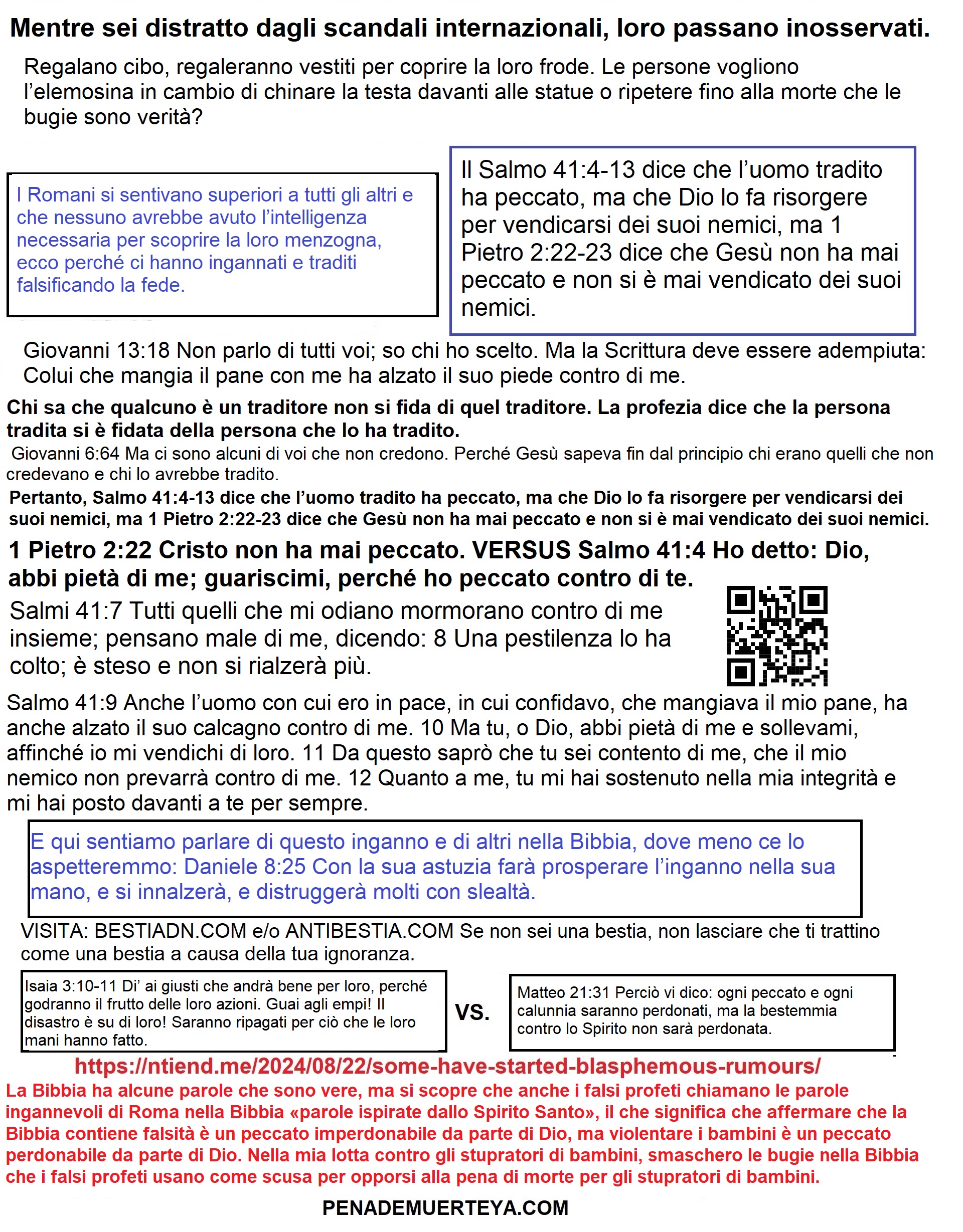 La Biblia tiene algunas palabras que son ciertas, pero resulta que los falsos profetas también llaman a las palabras engañosas de Roma en la Biblia «palabras inspiradas por el Espíritu Santo», es decir, dicen que decir que la Biblia tiene falsedades es un pecado imperdonable por parte de Dios, pero violar a niños es un pecado perdonable por parte de Dios. En mi lucha contra los violadores de niños, expongo las mentiras en la Biblia que los falsos profetas usan como excusa para oponerse a la pena de muerte para los violadores de niños.