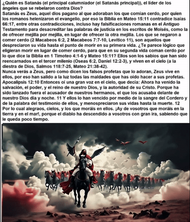 Satanás es Zeus, aquel dios pagano al que adoraban los que comían cerdo, por quien los romanos helenizaron el evangelio, por eso la Biblia en Mateo 15:11 contradice Isaías 66:17, entre otras contradicciones, incluso hay falsificaciones romanas en el Antiguo Testamento para desacreditar las palabras de justicia en los escritos de Moisés, como la de ofrecer mejilla por mejilla, en lugar de ofrecer la otra mejilla. Los que se negaron a comer cerdo (2 Macabeos 6:2, 2 Macabeos 7:7-10, Levítico 11), son aquellos que despreciaron su vida hasta el punto de morir en su primera vida. ¿Te parece lógico que eligieran morir en lugar de comer cerdo, para que en su segunda vida coman cerdo por lo que dice la Biblia en 1 Timoteo 4:1-6 y Mateo 15:11? Ellos son los sabios que han sido reencarnados en el tercer milenio (Oseas 6:2, Daniel 12:2-3), y viven en el cielo (a la diestra de Dios, Salmos 118:7-25, Mateo 21:38-42).