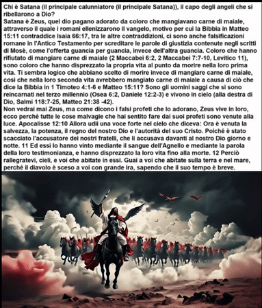 Satana è Zeus, quel dio pagano adorato da coloro che mangiavano carne di maiale, attraverso il quale i romani ellenizzarono il vangelo, motivo per cui la Bibbia in Matteo 15:11 contraddice Isaia 66:17, tra le altre contraddizioni, ci sono anche falsificazioni romane in l’Antico Testamento per screditare le parole di giustizia contenute negli scritti di Mosè, come l’offerta guancia per guancia, invece dell’altra guancia. Coloro che hanno rifiutato di mangiare carne di maiale (2 Maccabei 6:2, 2 Maccabei 7:7-10, Levitico 11), sono coloro che hanno disprezzato la propria vita al punto da morire nella loro prima vita. Ti sembra logico che abbiano scelto di morire invece di mangiare carne di maiale, così che nella loro seconda vita avrebbero mangiato carne di maiale a causa di ciò che dice la Bibbia in 1 Timoteo 4:1-6 e Matteo 15:11? Sono gli uomini saggi che si sono reincarnati nel terzo millennio (Osea 6:2, Daniele 12:2-3) e vivono in cielo (alla destra di Dio, Salmi 118:7-25, Matteo 21:38 -42).