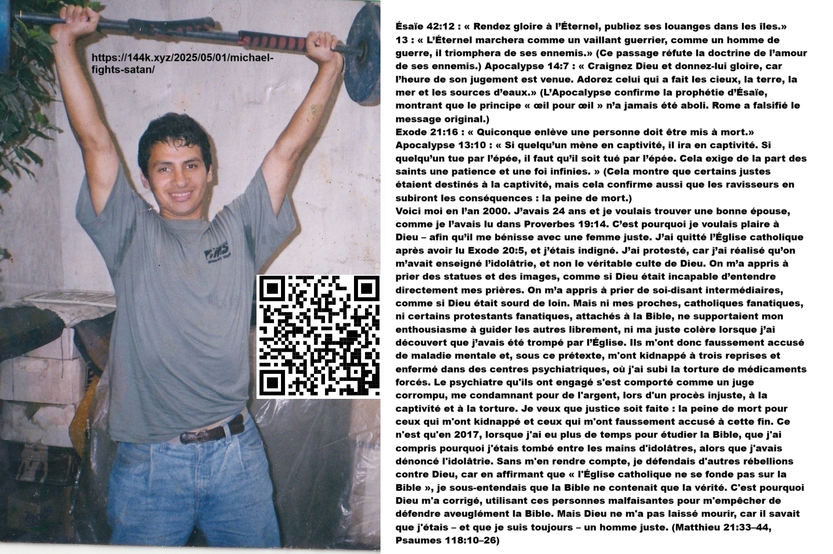 https://itwillbedotme.wordpress.com/wp-content/uploads/2025/03/idi04-elle-me-trouvera-la-femme-vierge-me-croira.docx Elle me trouvera, la femme vierge me croira. ( https://ellameencontrara.com – https://lavirgenmecreera.com – https://shewillfind.me ) Ceci est le blé dans la Bible qui détruit l’ivraie romaine dans la Bible : Apocalypse 19:11 Puis je vis le ciel ouvert, et voici un cheval blanc; celui qui le montait s’appelait Fidèle et Véritable, et c’est avec justice qu’il juge et fait la guerre. Apocalypse 19:19 Et je vis la bête, les rois de la terre et leurs armées rassemblés pour faire la guerre à celui qui était assis sur le cheval et à son armée. Psaume 2:2-4 «»Les rois de la terre se dressent, et les princes conspirent ensemble contre le Seigneur et contre son oint, en disant: ‘Brisons leurs liens et rejetons loin de nous leurs chaînes.’ Celui qui siège dans les cieux rit; le Seigneur se moque d’eux.»» Maintenant, un peu de logique élémentaire: si le cavalier se bat pour la justice, mais que la bête et les rois de la terre combattent contre ce cavalier, alors la bête et les rois de la terre sont contre la justice. Par conséquent, ils représentent la tromperie des fausses religions qui gouvernent avec eux. La grande prostituée de Babylone, qui est la fausse église créée par Rome, s’est considérée comme «»l’épouse de l’oint du Seigneur»», mais les faux prophètes de cette organisation qui vend des idoles et des paroles flatteuses ne partagent pas les objectifs personnels de l’oint du Seigneur et des vrais saints, car les dirigeants impies ont choisi pour eux-mêmes la voie de l’idolâtrie, du célibat ou de la sacralisation des mariages impurs en échange d’argent. Leurs sièges religieux sont remplis d’idoles, y compris de faux livres saints, devant lesquels ils se prosternent: Ésaïe 2:8-11 8 Leur pays est rempli d’idoles; ils se prosternent devant l’œuvre de leurs mains, devant ce que leurs doigts ont fabriqué. 9 L’homme est abaissé, et le mortel est humilié; ne leur pardonne pas. 10 Entre dans le rocher, cache-toi dans la poussière, devant la terreur du SEIGNEUR et la splendeur de sa majesté. 11 L’orgueil des hommes sera abaissé, et l’arrogance des hommes sera humiliée; seul le SEIGNEUR sera exalté en ce jour-là. Proverbes 19:14 Maison et richesses sont un héritage des pères, mais une femme prudente vient du SEIGNEUR. Lévitique 21:14 Le prêtre du SEIGNEUR ne prendra pas pour épouse une veuve, ni une divorcée, ni une femme impure, ni une prostituée; il prendra pour épouse une vierge de son propre peuple. Apocalypse 1:6 Et il a fait de nous des rois et des prêtres pour son Dieu et Père; à lui soient la gloire et la domination aux siècles des siècles. 1 Corinthiens 11:7 La femme est la gloire de l’homme. Que signifie dans l’Apocalypse que la bête et les rois de la terre font la guerre au cavalier du cheval blanc et à son armée ? Le sens est clair, les dirigeants du monde sont de mèche avec les faux prophètes qui sont les diffuseurs des fausses religions qui dominent parmi les royaumes de la terre, pour des raisons évidentes, qui incluent le christianisme, l’islam, etc. Ces dirigeants sont contre la justice et la vérité, qui sont les valeurs défendues par le cavalier du cheval blanc et son armée fidèle à Dieu. Comme il est évident, la tromperie fait partie des faux livres sacrés que ces complices défendent avec l’étiquette de « Livres autorisés des religions autorisées », mais la seule religion que je défends est la justice, je défends le droit des justes à ne pas se laisser tromper par les tromperies religieuses. Apocalypse 19:19 Puis je vis la bête et les rois de la terre et leurs armées rassemblés pour faire la guerre au cavalier du cheval et à son armée. Maintenant, un peu de logique de base, si le cavalier représente la justice, mais que la bête et les rois de la terre combattent ce cavalier, alors la bête et les rois de la terre sont contre la justice, par conséquent ils représentent la tromperie des fausses religions qui règnent avec eux.Un duro golpe de realidad es a «Babilonia» la «resurrección» de los justos, que es a su vez la reencarnación de Israel en el tercer milenio: La verdad no destruye a todos, la verdad no duele a todos, la verdad no incomoda a todos: Israel, la verdad, nada más que la verdad, la verdad que duele, la verdad que incomoda, verdades que duelen, verdades que atormentan, verdades que destruyen.C’est mon histoire: José, un jeune homme élevé dans les enseignements catholiques, a vécu une série d’événements marqués par des relations complexes et des manipulations. À 19 ans, il entame une relation avec Monica, une femme possessive et jalouse. Bien que José ait estimé qu’il devait mettre un terme à cette relation, son éducation religieuse l’a conduit à essayer de la changer par l’amour. Cependant, la jalousie de Monica s’est intensifiée, en particulier envers Sandra, une camarade de classe qui faisait des avances à José. Sandra a commencé à le harceler en 1995 avec des appels téléphoniques anonymes, au cours desquels elle faisait des bruits avec le clavier et raccrochait.