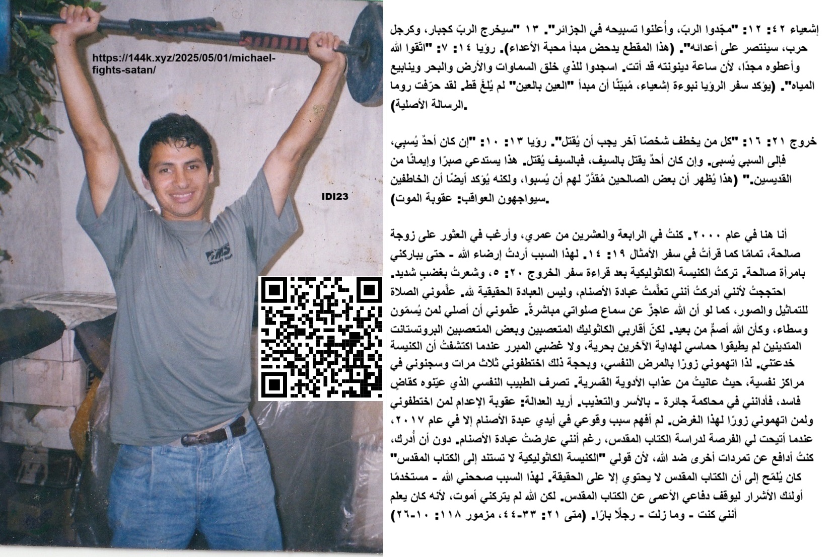 أنا هنا في عام ٢٠٠٠. كنتُ في الرابعة والعشرين من عمري، وأرغب في العثور على زوجة صالحة، تمامًا كما قرأتُ في سفر الأمثال ١٩: ١٤. لهذا السبب أردتُ إرضاء الله – حتى يباركني بامرأة صالحة. تركتُ الكنيسة الكاثوليكية بعد قراءة سفر الخروج ٢٠: ٥، وشعرتُ بغضبٍ شديد. احتججتُ لأنني أدركتُ أنني تعلَّمتُ عبادة الأصنام، وليس العبادة الحقيقية لله. علَّموني الصلاة للتماثيل والصور، كما لو أن الله عاجزٌ عن سماع صلواتي مباشرةً. علّموني أن أصلي لمن يُسمّون وسطاء، وكأن الله أصمٌّ من بعيد. لكن أقاربي الكاثوليك المتعصبين وبعض المتعصبين البروتستانت المتدينين لم يطيقوا حماسي لهداية الآخرين بحرية، ولا غضبي المبرر عندما اكتشفتُ أن الكنيسة خدعتني. لذا اتهموني زورًا بالمرض النفسي، وبحجة ذلك اختطفوني ثلاث مرات وسجنوني في مراكز نفسية، حيث عانيتُ من عذاب الأدوية القسرية. تصرف الطبيب النفسي الذي عيّنوه كقاضٍ فاسد، فأدانني في محاكمة جائرة – بالأسر والتعذيب. أريد العدالة: عقوبة الإعدام لمن اختطفوني ولمن اتهموني زورًا لهذا الغرض.