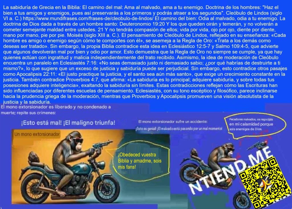 El amor a los enemigos es un engaño del enemigo de Dios, la negación de la ley que prohibe el consumo de alimentos como el cerdo y el murcielago también lo es; La Biblia tiene mentiras del imperio que jamás se convirtió a la fe que persiguió, el imperio romano persiguió esa fe para destruirla helenizandola. En la versión del evangelio falsificada por los romanos en Mateo 15:11 Jesús nos dice (Para negar la ley en Deuteronomio 14): «Coman de todo porque ya nada de lo que entra en la boca del hombre lo contamina», los romanos están así acusando a Jesús de algo que como fiel judío nunca dijo: Al igual que Antioco IV Epifanes, ellos tivieron en mente helenizar la verdadera religión. El evangelio fue helenizado por los romanos, como el rostro de Zeus, así nos dicen con las imágenes que era el rostro de Jesús; y la doctrina del griego Cleóbulo de Lindos es la que dice: «Ama a tu enemigo», pero nos dicen que Jesús la enseñó: Y eso es mentira. Antíoco IV Epífanes asesinó con torturas a ocho judíos, a siete hermanos y a su madre porque ellos se negaron a comer carne de cerdo porque Dios lo prohibe (Levítico 11, 2 Macabeos 7). La profecía en Isaías 65 confirma dos cosas: 1 # Dios ama a sus amigos y odia a sus enemigos. 2# El consumo de carne de cerdo se confirma prohibido. Antíoco, el rey griego: «¿Quieres comer carne de cerdo para que no te corten el cuerpo en pedazos? (2 Macabeos 7:7).» Zeús, el dios griego: «Nada de lo que yo Dios hice es malo si lo recibes rezándome, ¿se van a negar a comer carne de cerdo?, adorénme todos, los que no, vayán al fuego eterno (1 Timoteo 4:3, Hebreos 1:6, Lucas 11:28, Mateo 18:7).» La frase: «Haced el bien a vuestros amigos y enemigos, porque así conservareís los unos y os será posible atraer a los otros.» es de Cleóbulo de Lindos, «ama a tu enemigo es otra forma de decir lo mismo», pero aquello contradice la ley y los profetas, Jesús respetaba la palabra de Dios, pero los perseguidores romanos no.