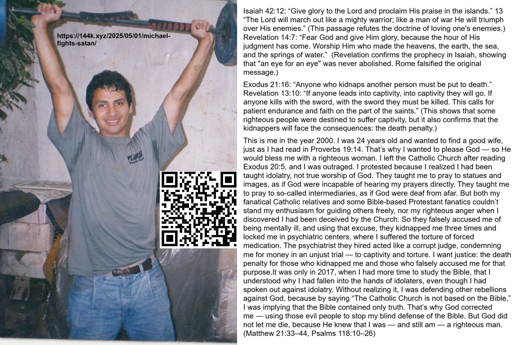 This is me in the year 2000. I was 24 years old and wanted to find a good wife, just as I had read in Proverbs 19:14. That’s why I wanted to please God — so He would bless me with a righteous woman. I left the Catholic Church after reading Exodus 20:5, and I was outraged. I protested because I realized I had been taught idolatry, not true worship of God. They taught me to pray to statues and images, as if God were incapable of hearing my prayers directly. They taught me to pray to so-called intermediaries, as if God were deaf from afar. But both my fanatical Catholic relatives and some Bible-based Protestant fanatics couldn’t stand my enthusiasm for guiding others freely, nor my righteous anger when I discovered I had been deceived by the Church. So they falsely accused me of being mentally ill, and using that excuse, they kidnapped me three times and locked me in psychiatric centers, where I suffered the torture of forced medication. The psychiatrist they hired acted like a corrupt judge, condemning me for money in an unjust trial — to captivity and torture. I want justice: the death penalty for those who kidnapped me and those who falsely accused me for that purpose.