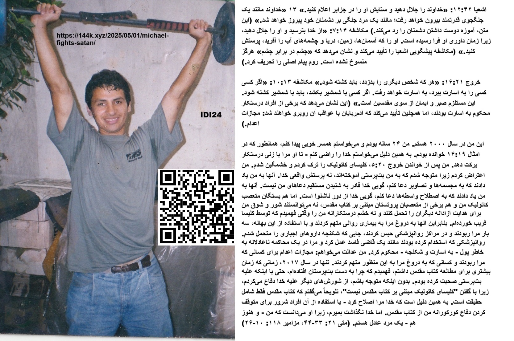 این من در سال ۲۰۰۰ هستم. من ۲۴ ساله بودم و میخواستم همسر خوبی پیدا کنم، همانطور که در امثال ۱۹:۱۴ خوانده بودم. به همین دلیل میخواستم خدا را راضی کنم – تا او مرا با زنی صالح برکت دهد. من پس از خواندن خروج ۲۰:۵، کلیسای کاتولیک را ترک کردم و خشمگین شدم. من اعتراض کردم زیرا متوجه شدم که بتپرستی به من آموخته شده است، نه پرستش واقعی خدا. آنها به من آموختند که به مجسمهها و تصاویر دعا کنم، گویی خدا قادر به شنیدن مستقیم دعاهای من نیست. آنها به من آموختند که به اصطلاح واسطهها دعا کنم، گویی خدا از دور ناشنوا است. اما هم بستگان متعصب کاتولیک من و هم برخی از متعصبان پروتستانِ معتقد به کتاب مقدس، نه اشتیاق من برای هدایت آزادانه دیگران را تحمل کردند و نه خشم برحق من را وقتی فهمیدم که توسط کلیسا فریب خوردهام. بنابراین آنها به دروغ مرا به بیماری روانی متهم کردند و با استفاده از این بهانه، سه بار مرا ربودند و در مراکز روانپزشکی حبس کردند، جایی که شکنجه داروهای اجباری را متحمل شدم. روانپزشکی که استخدام کرده بودند مانند یک قاضی فاسد عمل کرد و مرا در یک محاکمه ناعادلانه به خاطر پول – به اسارت و شکنجه – محکوم کرد. من عدالت میخواهم: مجازات اعدام برای کسانی که مرا ربودند و کسانی که به دروغ مرا به این منظور متهم کردند.