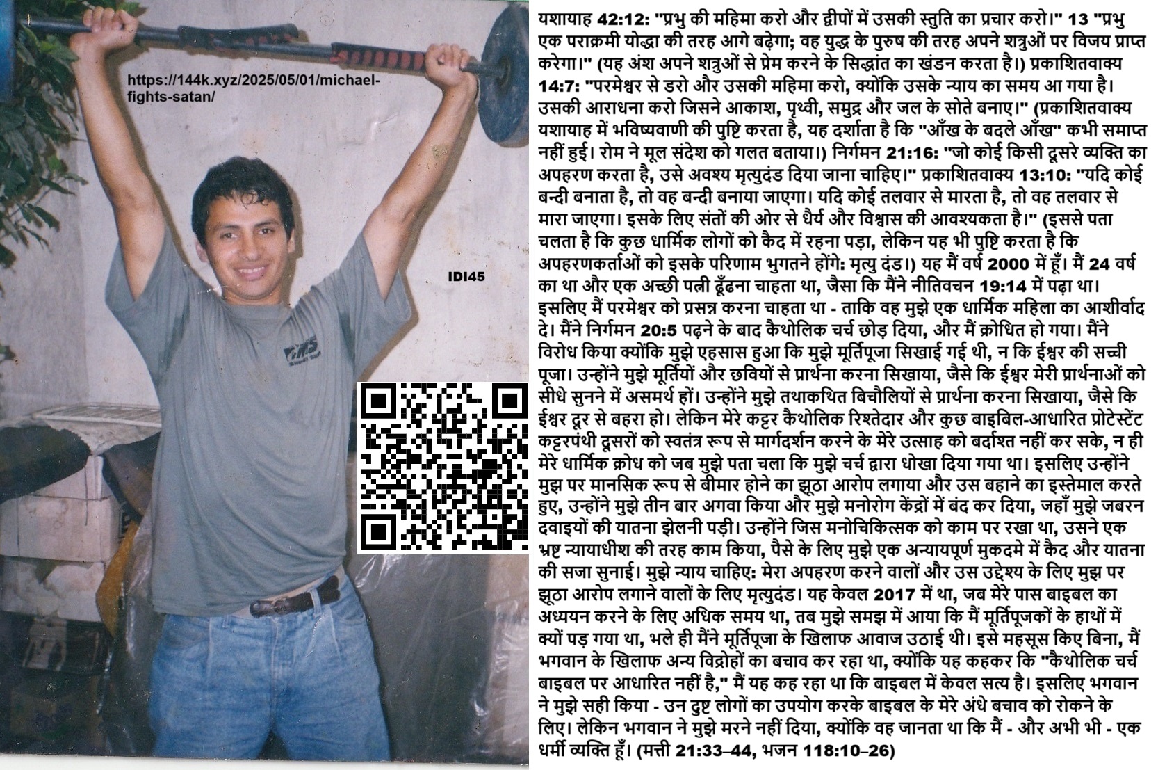 निर्गमन 21:16: “जो कोई किसी दूसरे व्यक्ति का अपहरण करता है, उसे अवश्य मृत्युदंड दिया जाना चाहिए।” प्रकाशितवाक्य 13:10: «»यदि कोई बंदी बनाता है, तो वह बंदी बनाया जाएगा। यदि कोई तलवार से मारता है, तो वह तलवार से मारा जाएगा। इसके लिए संतों की ओर से धैर्य और विश्वास की आवश्यकता है।»» (यह दर्शाता है कि कुछ धर्मी लोगों को बंदी बनाए जाने के लिए नियत किया गया था, लेकिन यह भी पुष्टि करता है कि अपहरणकर्ताओं को परिणाम भुगतने होंगे: मृत्युदंड।) यह मैं वर्ष 2000 में हूँ। मैं 24 वर्ष का था और एक अच्छी पत्नी ढूँढना चाहता था, जैसा कि मैंने नीतिवचन 19:14 में पढ़ा था। इसलिए मैं परमेश्वर को प्रसन्न करना चाहता था – ताकि वह मुझे एक धर्मी महिला का आशीर्वाद दे। मैंने निर्गमन 20:5 पढ़ने के बाद कैथोलिक चर्च छोड़ दिया, और मैं क्रोधित हो गया। मैंने विरोध किया क्योंकि मुझे एहसास हुआ कि मुझे मूर्तिपूजा सिखाई गई थी, न कि ईश्वर की सच्ची पूजा। उन्होंने मुझे मूर्तियों और छवियों से प्रार्थना करना सिखाया, जैसे कि ईश्वर मेरी प्रार्थनाओं को सीधे सुनने में असमर्थ थे। उन्होंने मुझे तथाकथित मध्यस्थों से प्रार्थना करना सिखाया, जैसे कि ईश्वर दूर से बहरा हो। लेकिन मेरे कट्टर कैथोलिक रिश्तेदार और कुछ बाइबल-आधारित प्रोटेस्टेंट कट्टरपंथी दूसरों को स्वतंत्र रूप से मार्गदर्शन करने के मेरे उत्साह को बर्दाश्त नहीं कर सके, न ही मेरे धार्मिक क्रोध को जब मैंने पाया कि मुझे चर्च द्वारा धोखा दिया गया था। इसलिए उन्होंने मुझ पर मानसिक रूप से बीमार होने का झूठा आरोप लगाया, और उस बहाने का उपयोग करते हुए, उन्होंने मुझे तीन बार अगवा किया और मुझे मनोरोग केंद्रों में बंद कर दिया, जहाँ मुझे जबरन दवाइयों की यातना झेलनी पड़ी। उन्होंने जिस मनोचिकित्सक को काम पर रखा, उसने एक भ्रष्ट न्यायाधीश की तरह काम किया, जिसने पैसे के लिए मुझे एक अन्यायपूर्ण मुकदमे में कैद और यातना के लिए दोषी ठहराया। मैं न्याय चाहता हूँ: मेरा अपहरण करने वालों और उस उद्देश्य के लिए मुझ पर झूठा आरोप लगाने वालों के लिए मृत्युदंड।