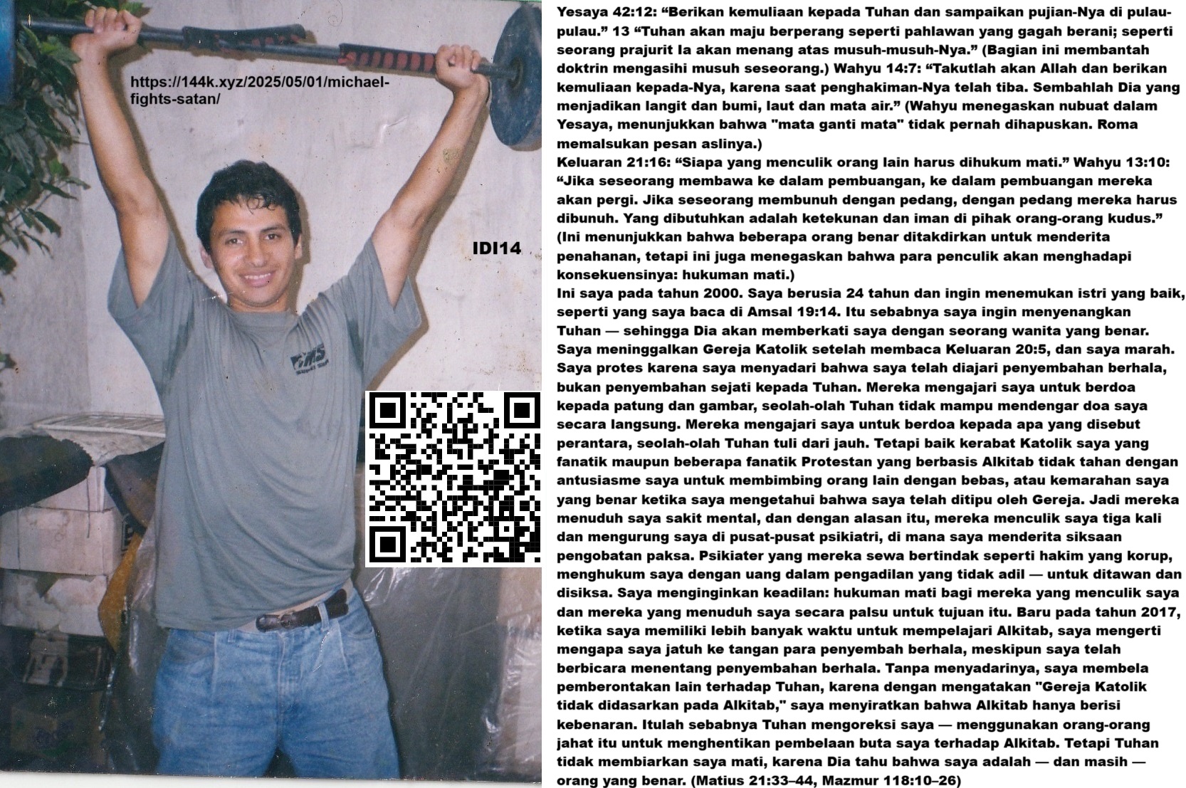 Ini saya pada tahun 2000. Saya berusia 24 tahun dan ingin menemukan istri yang baik, seperti yang saya baca di Amsal 19:14. Itulah sebabnya saya ingin menyenangkan Tuhan — agar Dia memberkati saya dengan seorang wanita yang benar. Saya meninggalkan Gereja Katolik setelah membaca Keluaran 20:5, dan saya marah. Saya protes karena saya menyadari bahwa saya telah diajari penyembahan berhala, bukan penyembahan sejati kepada Tuhan. Mereka mengajari saya untuk berdoa kepada patung dan gambar, seolah-olah Tuhan tidak mampu mendengar doa saya secara langsung. Mereka mengajari saya untuk berdoa kepada apa yang disebut perantara, seolah-olah Tuhan tuli dari jauh. Namun, baik saudara-saudara Katolik saya yang fanatik maupun beberapa penganut Protestan yang fanatik terhadap Alkitab tidak tahan dengan antusiasme saya untuk membimbing orang lain dengan bebas, maupun kemarahan saya yang wajar ketika saya mengetahui bahwa saya telah ditipu oleh Gereja. Jadi, mereka menuduh saya sakit mental, dan dengan alasan itu, mereka menculik saya tiga kali dan mengurung saya di pusat-pusat psikiatri, tempat saya menderita penyiksaan dengan obat-obatan paksa. Psikiater yang mereka sewa bertindak seperti hakim yang korup, menghukum saya dengan uang dalam pengadilan yang tidak adil — untuk ditawan dan disiksa. Saya menginginkan keadilan: hukuman mati bagi mereka yang menculik saya dan mereka yang menuduh saya secara palsu untuk tujuan itu.
