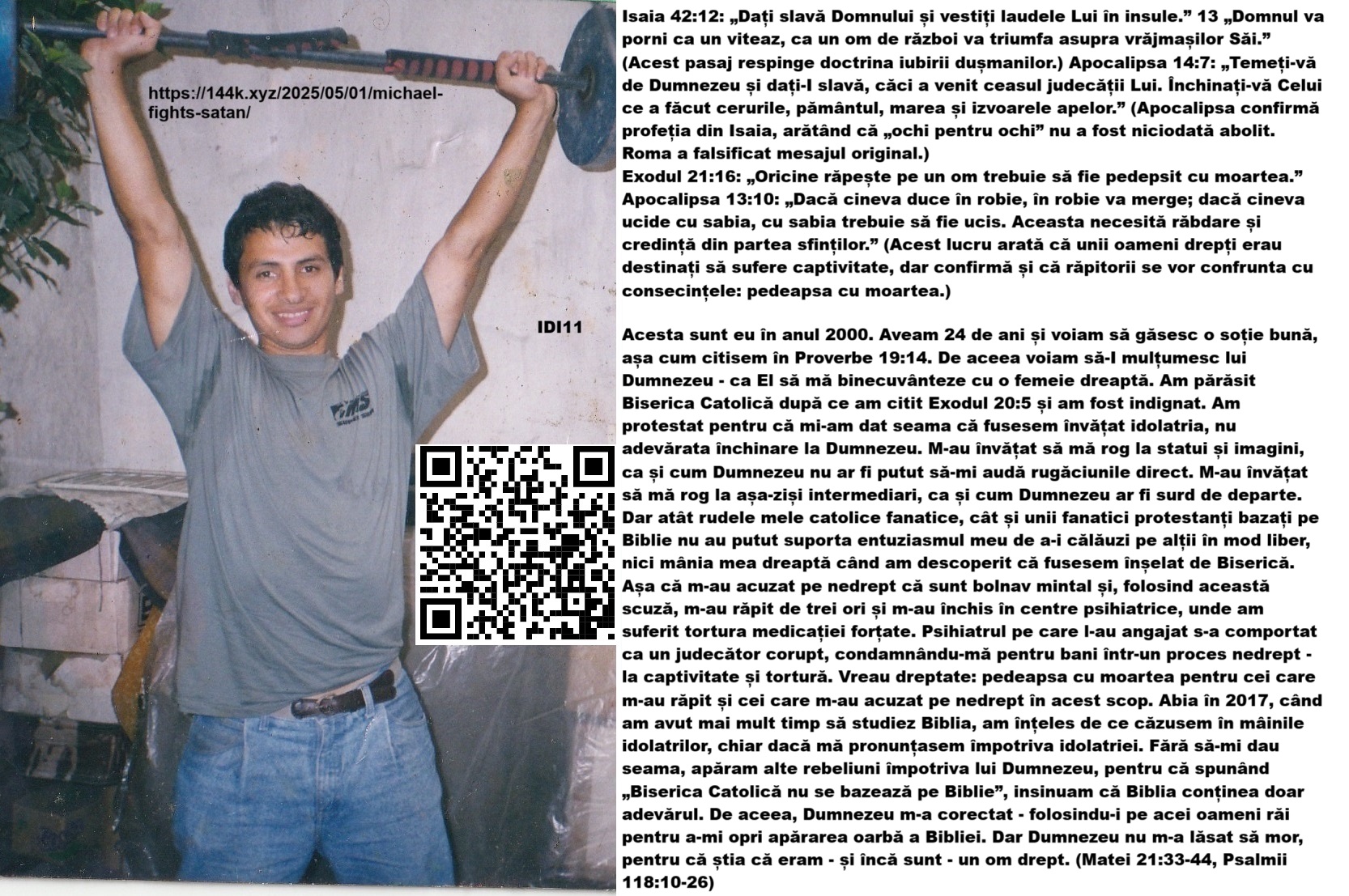 Acesta sunt eu în anul 2000. Aveam 24 de ani și voiam să găsesc o soție bună, așa cum citisem în Proverbe 19:14. De aceea voiam să-I mulțumesc lui Dumnezeu – ca El să mă binecuvânteze cu o femeie dreaptă. Am părăsit Biserica Catolică după ce am citit Exodul 20:5 și am fost indignat. Am protestat pentru că mi-am dat seama că fusesem învățat idolatria, nu adevărata închinare la Dumnezeu. M-au învățat să mă rog la statui și imagini, ca și cum Dumnezeu nu ar fi putut să-mi audă rugăciunile direct. M-au învățat să mă rog la așa-ziși intermediari, ca și cum Dumnezeu ar fi surd de departe. Dar atât rudele mele catolice fanatice, cât și unii fanatici protestanți bazați pe Biblie nu au putut suporta entuziasmul meu de a-i călăuzi pe alții în mod liber, nici mânia mea dreaptă când am descoperit că fusesem înșelat de Biserică. Așa că m-au acuzat pe nedrept că sunt bolnav mintal și, folosind această scuză, m-au răpit de trei ori și m-au închis în centre psihiatrice, unde am suferit tortura medicației forțate. Psihiatrul pe care l-au angajat s-a comportat ca un judecător corupt, condamnându-mă pentru bani într-un proces nedrept – la captivitate și tortură. Vreau dreptate: pedeapsa cu moartea pentru cei care m-au răpit și cei care m-au acuzat pe nedrept în acest scop.