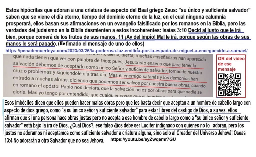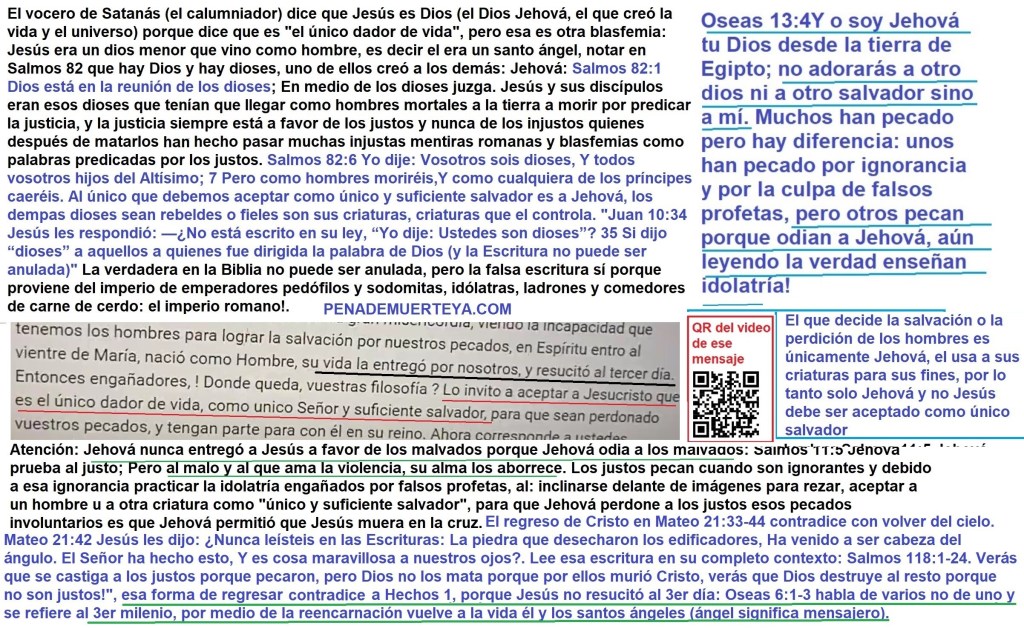 ¿Tú «unico señor y salvador» te enseña a dar falso testimonio contra inocentes para que sean secuestrados, pero que con solo reconocerlo como tu «único señor y salvador» serás perdonado por Dios?, Satanás te ha mentido, la verdad te dará un golpe de realidad. Entonces te acordarás de mí, y de que el amor al enemigo nunca fue el mandamiento de Dios dado por el Hijo de Dios antes de ser asesinado por el imperio que adulteró su mandamiento después: