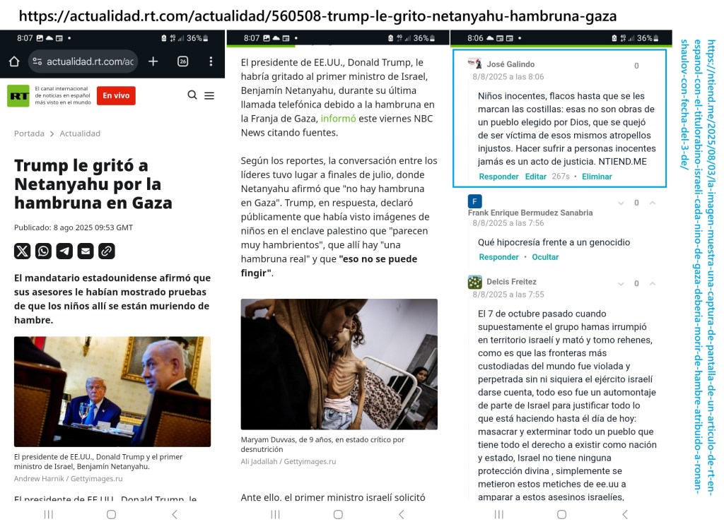 «Rabino israelí: ‘Cada niño de Gaza debería morir de hambre'», atribuido a Ronan Shaulov, con fecha del 3 de agosto de 2025. La cita dice que los niños gazatíes crecerán sin piedad hacia Israel, y el rabino habría instado abiertamente a matar de hambre a toda la población de Gaza.