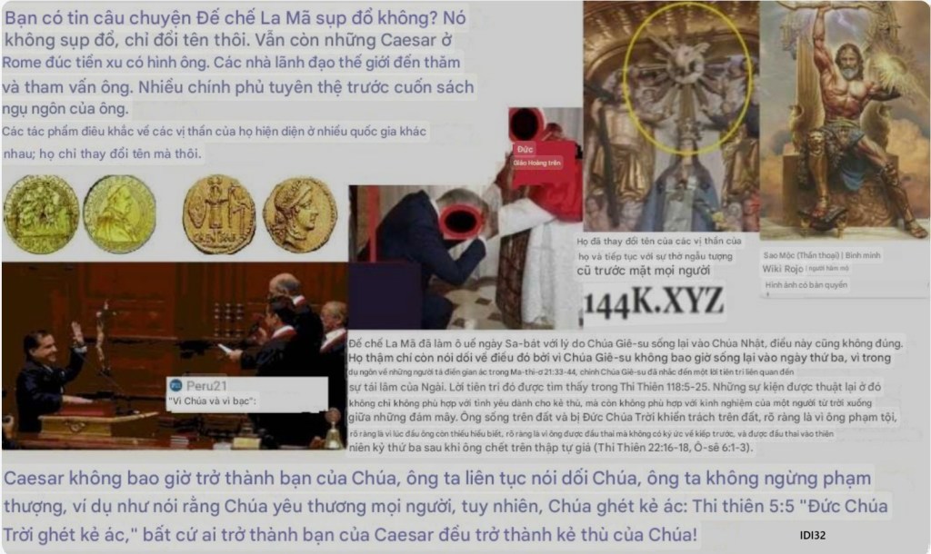 Sự đạo đức giả ở mức cao nhất: Họ nói rằng họ không thờ lạy hình tượng, mà chỉ “tôn kính” chúng thôi. Họ phủ nhận việc thờ lạy con thú (kẻ bách hại La Mã), nhưng lại cầu nguyện trước bức tượng một người lính La Mã với đôi cánh, thanh gươm và tấm khiên. Để che đậy, họ gọi đó là “Thánh Michael.” La Mã chưa bao giờ chấp nhận đức tin của Chúa Giêsu: họ đã làm giả nó. Họ thay thế các thần tượng của các dân tộc bằng thần tượng của chính mình — Jupiter và Samael đội lốt Giêsu và Thánh Michael — đồng thời áp đặt sự phục tùng bằng những câu nói như “hãy đưa má bên kia.” Chúa Giêsu thật và Michael thật sẽ không bao giờ yêu cầu người ta cầu nguyện với họ, hay với hình tượng của họ. Không phải Tây Ban Nha đã chinh phục châu Mỹ: mà là giới lãnh đạo tối cao của La Mã, dùng các vị vua bù nhìn để cướp vàng, bạc và nô lệ cho các thần tượng của họ. Và cho đến nay, những lá cờ của Vatican tại các quảng trường trung tâm vẫn nhắc nhở ai còn là thuộc địa của La Mã, với những nhà cầm quyền bù nhìn tuyên thệ hiến pháp của họ trên cuốn sách của La Mã. Ai có thể hiểu được, thì hãy hiểu.