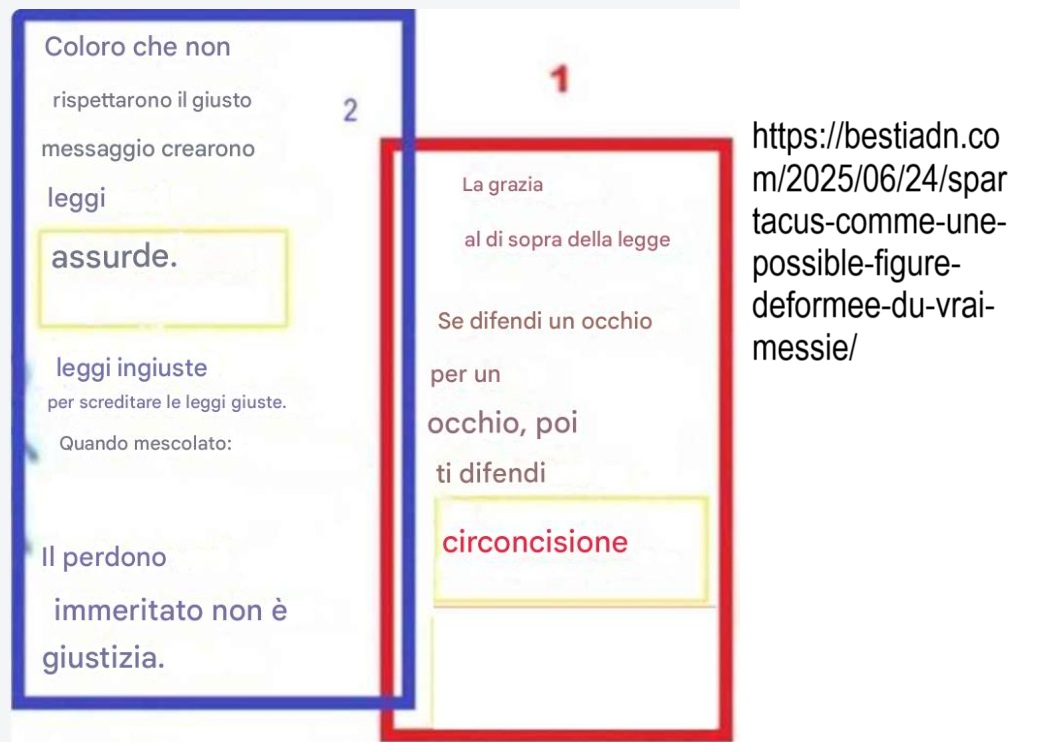 Todos los días la misma estúpida canción, la misma estúpida pirueta con una pelota ensalzada, y las mismas estúpidas soluciones aplicadas.La vergine giusta mi crederà e si unirà a me in matrimonio, senza cercare l’approvazione di alcuna falsa religione del serpente. Un serpente che, in cambio di denaro, disprezzò l’ideale degli uomini giusti e li calunniò contro i loro veri interessi: Levitico 21:13 Prenderà in moglie una vergine. 14 Non prenderà una vedova, una donna divorziata, una donna disonorata o una prostituta, ma prenderà in moglie una vergine tra il suo popolo, 15 affinché non profani la sua discendenza tra il suo popolo; poiché io, il Signore, sono colui che lo santifica. Un serpente che indossò una toga per difendere la tradizione greca, come il consumo di carne di maiale, basandosi su messaggi falsificati: le parole del serpente: ‘ Dio ha davvero detto: ‘Non devi mangiare quel frutto’ (il maiale)? Nulla di ciò che Dio ha creato è cattivo se lo si riceve con gratitudine… ‘ Un serpente calunniò Dio perché Roma non difese la parola dei giusti, ma quella del serpente, che fece passare per tale, dicendo che Dio ama tutti e che quindi la salvezza consiste nell’amare il proprio nemico. È come dire che il veleno smette di essere veleno con le parole, o che un traditore smette di esserlo con un trattamento gentile. Tuttavia, l’amore di Dio è selettivo: Naum 1:2 Il Signore è un Dio geloso e vendicatore; il Signore si vendica ed è pieno di furore; si vendica dei suoi avversari e serba rancore ai suoi nemici. Naum 1:7 Il Signore è buono, un rifugio nel giorno dell’angoscia; egli si prende cura di coloro che confidano in lui. 8 Ma con un’inondazione travolgente farà una fine dei suoi avversari, e le tenebre inseguiranno i suoi nemici. La protezione divina di Dio è riservata solo ai giusti: Salmo 5:11 Ma si rallegrino tutti quelli che si rifugiano in te; esultino per sempre, perché tu li difendi.