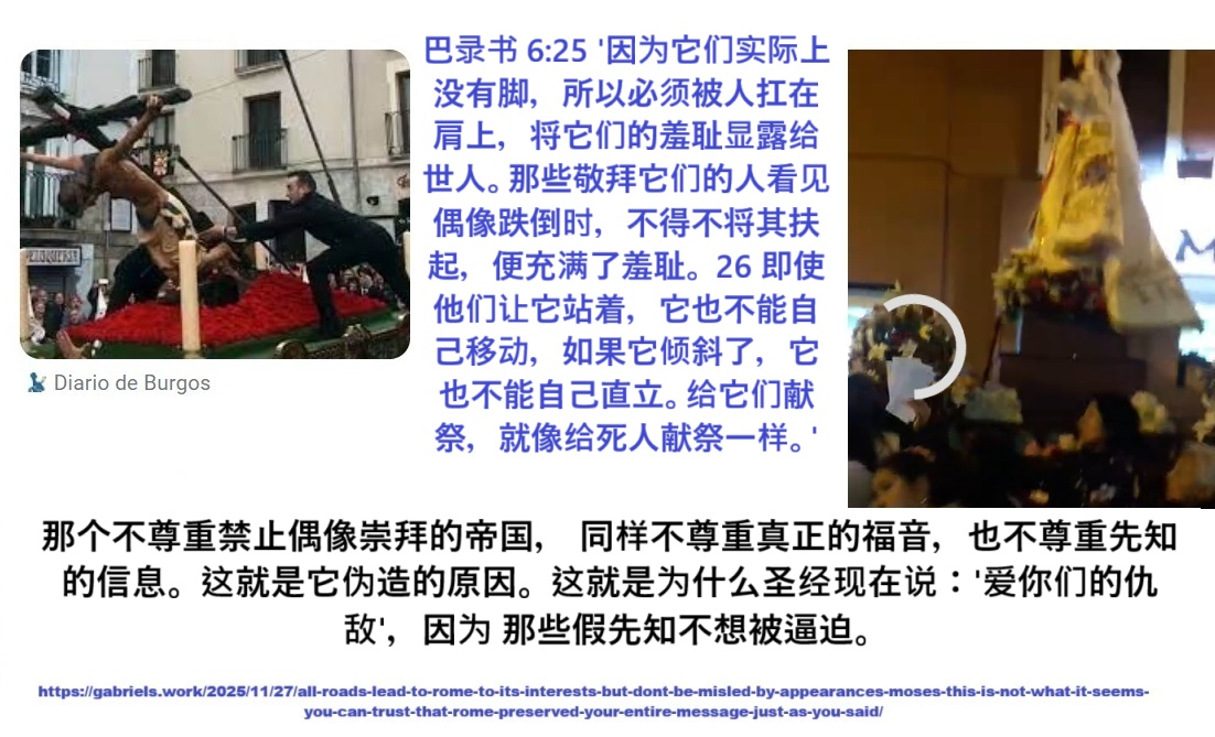 那个不尊重禁止偶像崇拜的帝国, 同样不尊重真正的福音,也不尊重先知的信息。 这就是它伪造的原因。 这就是为什么圣经现在说:’爱你们的仇敌’,因为 那些假先知不想被逼迫。