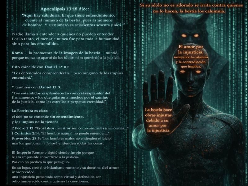 Salmos 112:9 Reparte, da a los pobres; Su justicia permanece para siempre; Su poder será exaltado en gloria. 10 Lo verá el impío y se irritará; Crujirá los dientes, y se consumirá. El deseo de los impíos perecerá.El malvado nunca reconoce que adorar imágenes es un pecado. En cambio, el justo sí lo reconoce, porque su reacción ante la verdad es distinta. Éxodo 20:5 No te inclinarás ante imágenes ni las adorarás. En la otra vida, el justo descubre la verdad y se siente indignado contra los malvados que con falsas enseñanzas le hicieron cometer idolatría. Por eso busca volver al camino de la justicia. Salmos 41:4-5 Dije: ‘Señor, ten misericordia de mí y sana mi alma, porque he pecado contra ti.’ Mis enemigos hablan mal de mí, preguntando: ‘¿Cuándo morirá y será olvidado su nombre?’ Por ese motivo, él está ‘vestido de cilicio’, una expresión que representa su indignación y su dolor por haber caído en la trampa de los engañadores. Él no está buscando arrepentirse, porque ya lo está. Lo que busca es justicia. Apocalipsis 11:3 Daré poder a mis dos testigos para que profeticen durante 1260 días, vestidos de cilicio. Lucas 17:28-30 En los días de Lot, la gente comía, bebía, compraba, vendía, plantaba y construía. Pero el día que Lot salió de Sodoma, llovió fuego y azufre del cielo y los destruyó a todos. Así será cuando el Hijo del Hombre se manifieste. Pero esta penitencia no durará para siempre, sino por 1260 días (un tiempo, tiempos y medio tiempo, donde ‘un tiempo’ equivale a 360 días). Daniel 12:7 Entonces oí al hombre vestido de lino, que estaba sobre las aguas del río. Levantó sus manos al cielo y juró por el que vive para siempre que todo esto terminará después de un tiempo, tiempos y la mitad de un tiempo. Cuando el poder del pueblo santo sea quebrantado, todas estas cosas se cumplirán. https://naodanxxii.wordpress.com/wp-content/uploads/2025/11/idi01-las-cartas-paulinas-y-las-otras-mentiras-de-roma-en-la-biblia.pdf .» «La religión que yo defiendo se llama justicia. █ Yo la encontraré cuando ella me encuentre y me creerá lo que cuento. El Imperio romano ha traicionado a la humanidad inventando religiones para someterla. Todas las religiones institucionalizadas son falsas. Todos los libros sagrados de esas religiones contienen fraudes. Sin embargo, hay mensajes que tienen sentido. Y hay otros, faltantes, que pueden deducirse a partir de los legítimos mensajes de justicia. Daniel 12:1-13 — ‘El príncipe que lucha por la justicia se levantará para recibir la bendición de Dios.’ Proverbios 18:22 — ‘La esposa es la bendición que Dios le da al hombre.’ Levítico 21:14 — ‘Él debe desposar una mujer virgen de su misma fe, porque ella es del mismo pueblo de él, el que será libertado cuando los justos se levanten.’ 📚 ¿Qué es una religión institucionalizada? Una religión institucionalizada es cuando una creencia espiritual se transforma en una estructura de poder formal, diseñada para controlar personas. Deja de ser una búsqueda individual de la verdad o la justicia, y se convierte en un sistema dominado por jerarquías humanas, al servicio del poder político, económico o social. Ya no importa lo que es justo, verdadero o real. Lo único que importa es obedecer. Una religión institucionalizada incluye: Iglesias, sinagogas, mezquitas, templos. Líderes religiosos con poder (curas, pastores, rabinos, imanes, papas, etc.). Textos sagrados ‘oficiales’ manipulados y fraudulentos. Dogmas que no se pueden cuestionar. Reglas impuestas sobre la vida personal de las personas. Ritos y rituales obligatorios para poder ‘pertenecer’. Es la forma en que el Imperio romano, y luego otros imperios, usaron la fe para someter a los pueblos. Convirtieron lo sagrado en negocio. Y la verdad, en herejía. Si todavía crees que obedecer a una religión es lo mismo que tener fe, te mintieron. Si todavía confías en sus libros, confías en los mismos que crucificaron la justicia. No es Dios quien habla en sus templos. Es Roma. Y Roma nunca dejó de hablar. Despierta. El que busca justicia no necesita permiso. Ni institución.